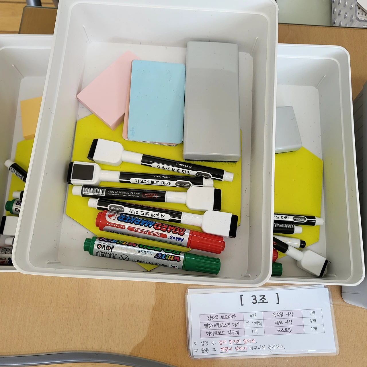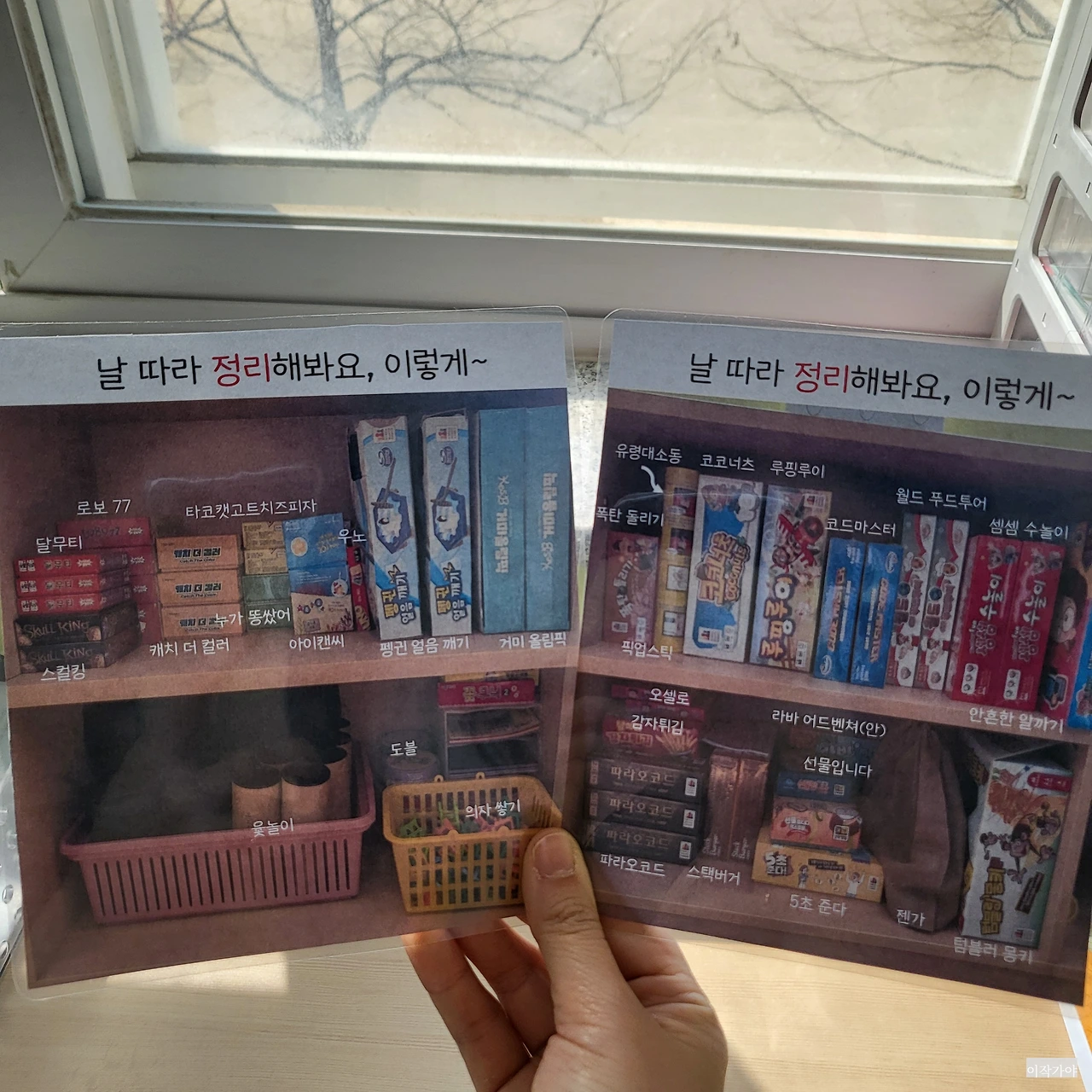교실에 있는 보드게임은 소모품으로 생각하는 게 제일 속 편하다고 한다. 하지만 공공의 물건을 소중히 대하고, 자기가 사용한 물건을 스스로 정리해야 한다는 덕목까지 포기할 수는 없는 법. 그래셔 정리된 보드게임 존을 찍어 서랍장 앞에 붙였다.