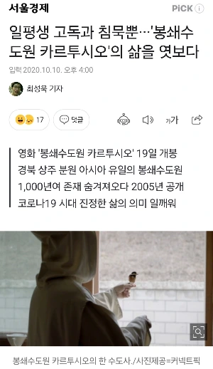 일평생을고독과 침묵 속에 살아야 하는 <카르투시오>. 침묵 수도원에 대해 처음 들었을 때는 답답해서 하루라도 살 수 있을까 싶었다. 그런데 지금은 오히려 부럽기도 하다.