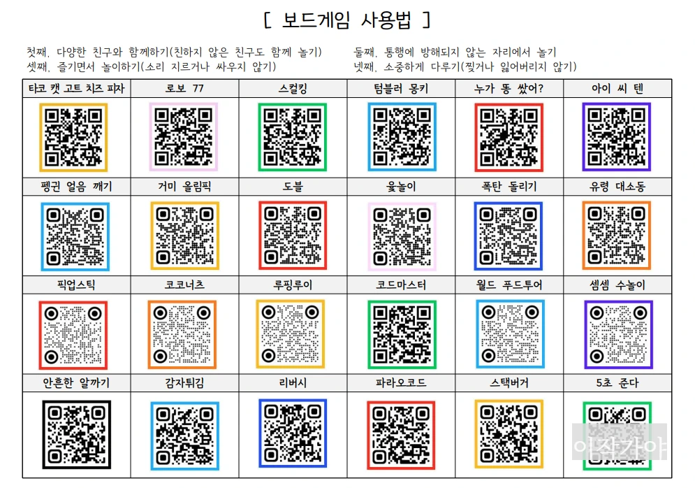 내 목을 지키는 방법이 하나 더 있다. 보드게임 매뉴얼 QR 코드이다. 아무래도 보드게임은 매뉴얼을 읽는 것보다 동영상을 보는 게 이해가 쉽다. 각 보드게임별로 이해가 쉬운 영상을 골라 QR 코드를 만들었다. 교실에 있는 태블릿을 활용하여 아이들이 게임 규칙을 익히고, 다양한 친구들과 즐겁게 놀 수 있으면 좋겠다.