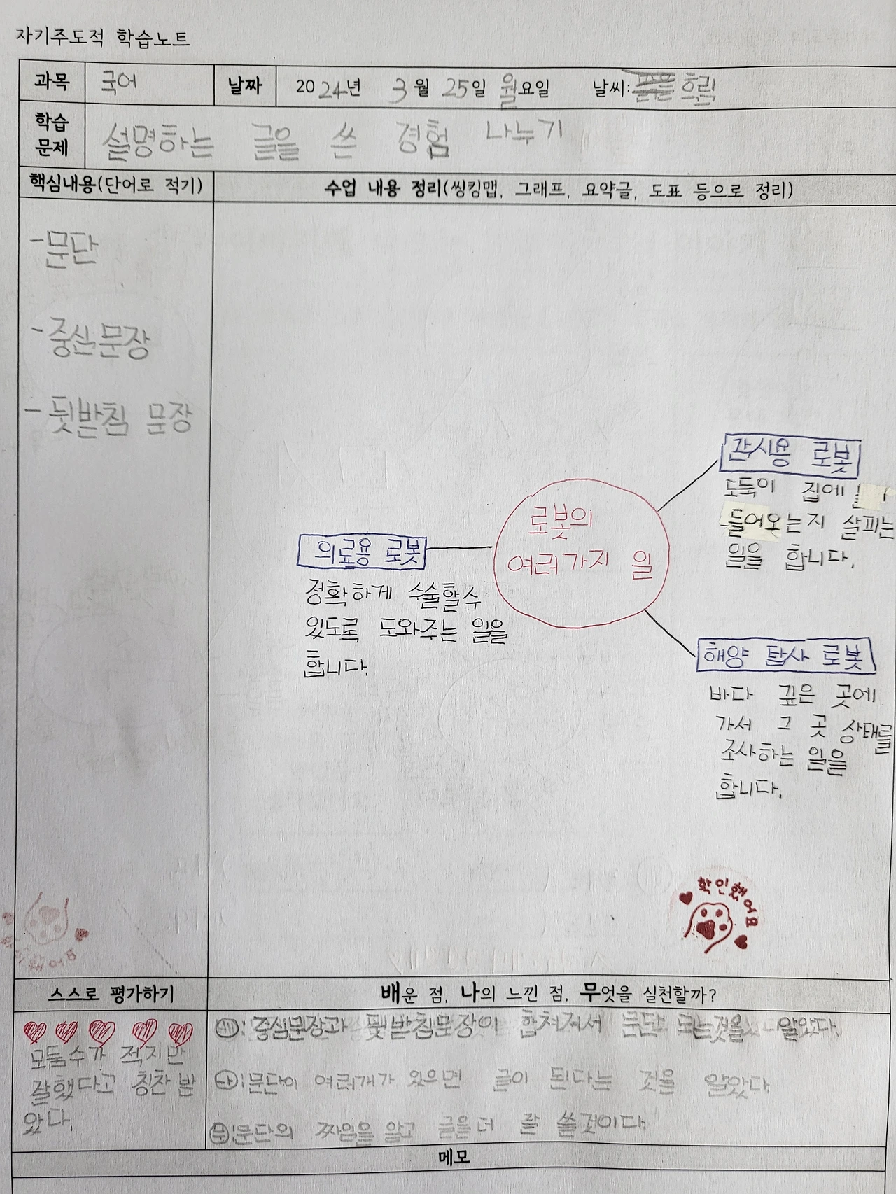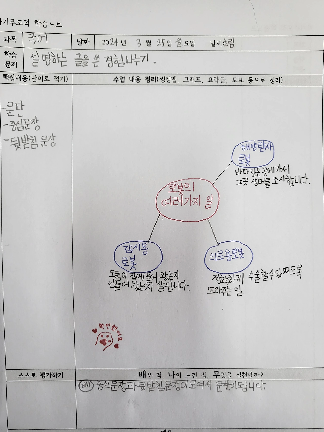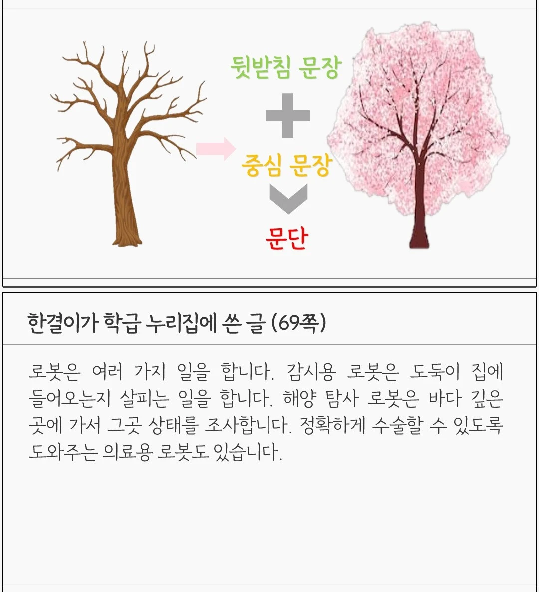 배움 공책을 작성한다. 모둠별로 활동한 내용을 바탕으로 개인 배움 공책을 작성하고 있다. 학생들 스스로 학습 내용을 정리하는 것은 아직 어렵다. 예컨대 오늘 차시 공부의 핵심이 문단의 짜임인데, 설명문(예. 로봇)을 읽으면 로봇이 중심 내용이라고 생각하는 아이들이 몇몇 있다. '배나무'에서는 일반화된 지식을 끌어내는 것이 목표...!