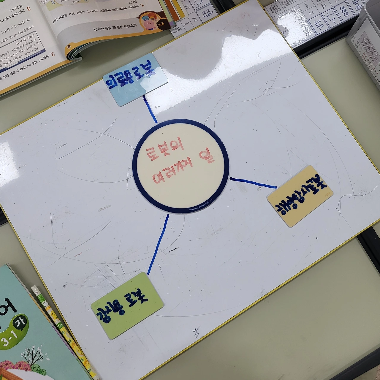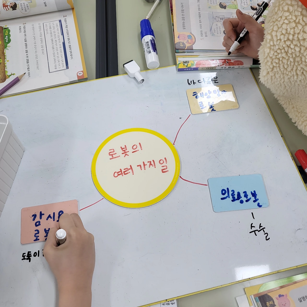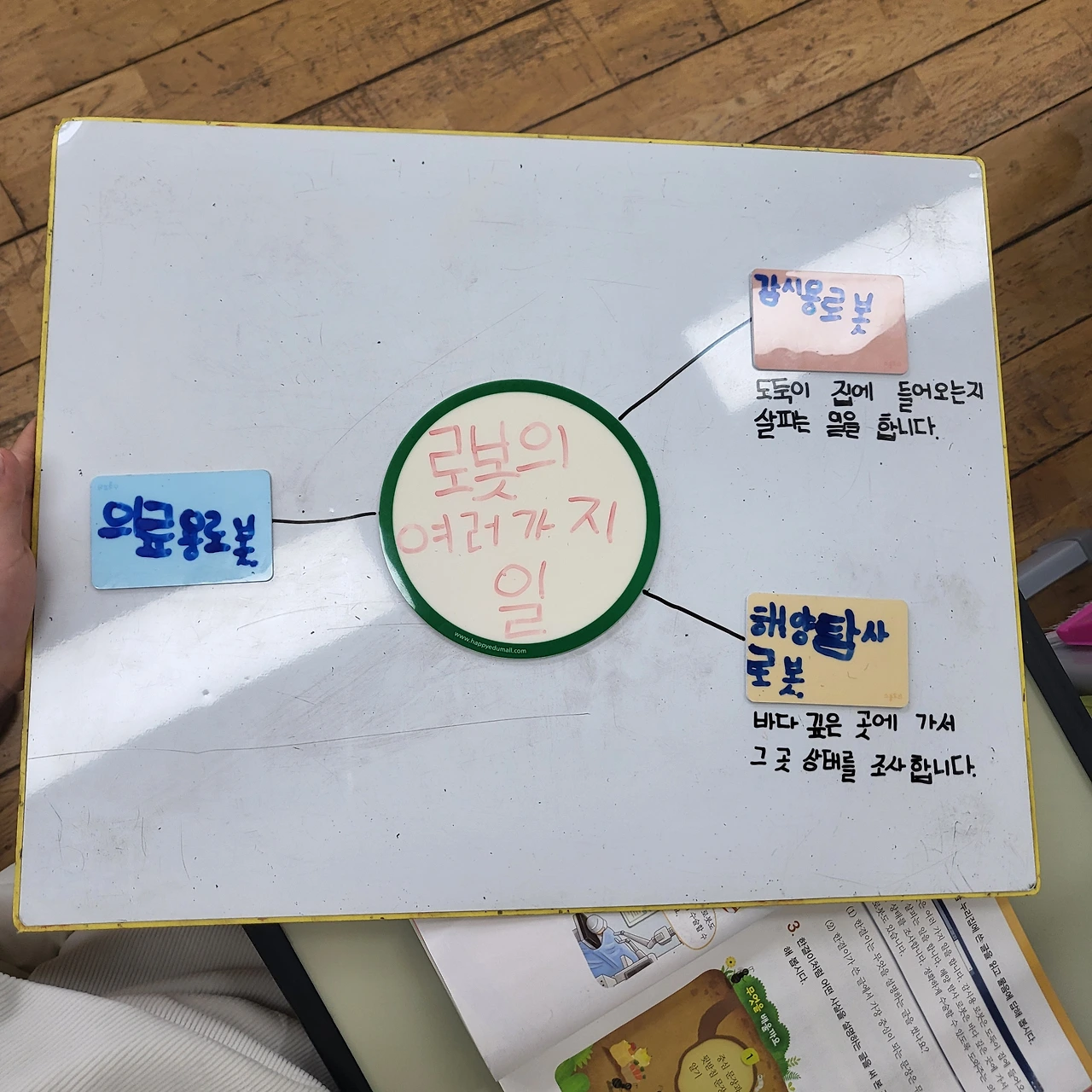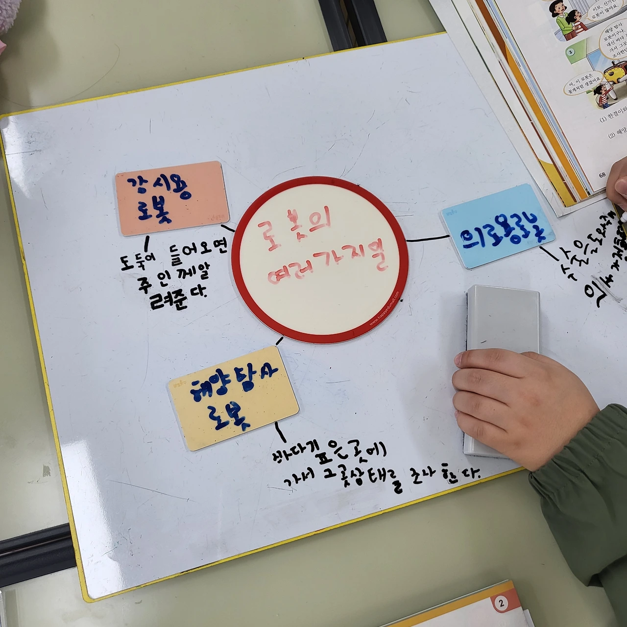 배움 공책을 작성한다. 모둠별로 활동한 내용을 바탕으로 개인 배움 공책을 작성하고 있다. 학생들 스스로 학습 내용을 정리하는 것은 아직 어렵다. 예컨대 오늘 차시 공부의 핵심이 문단의 짜임인데, 설명문(예. 로봇)을 읽으면 로봇이 중심 내용이라고 생각하는 아이들이 몇몇 있다. '배나무'에서는 일반화된 지식을 끌어내는 것이 목표...!