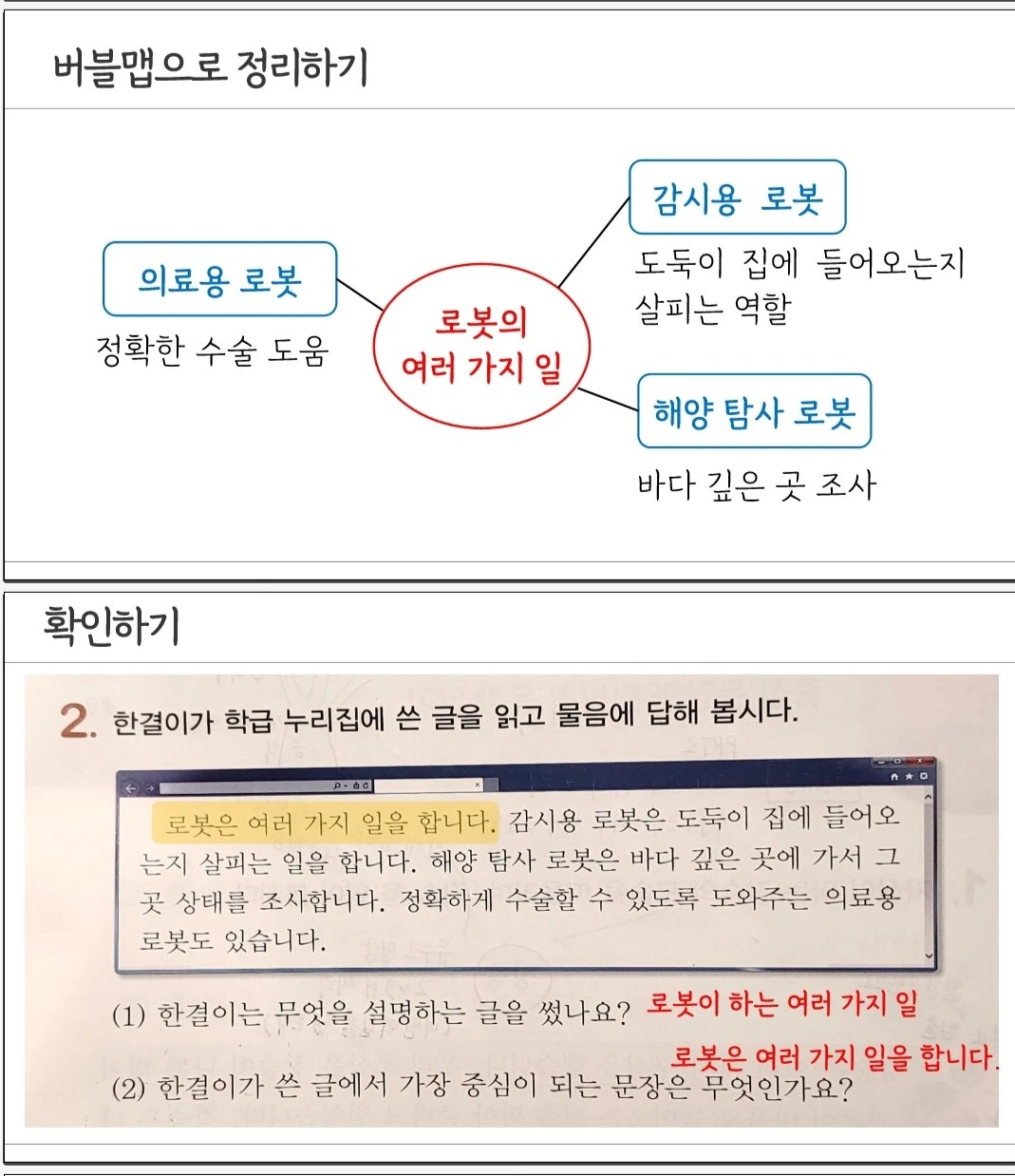 이번 단원 역시 교과서 지면 구성을 살폈을 때, 중심 문장과 뒷받침 문장을 찾아서 쓰는 활동이 많았다. 나는 유독 아이들이 별생각 없이, 내가 띄운 예시 답안을 따라 쓰기 바쁜 것이 안타까웠다. 그래서 싱킹맵으로 읽은 내용을 도식화하는 수업을 구성하고자 했다.