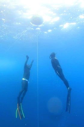바다에 부이를 띄워 놓고 부이에 연결된 줄을 잡고 몇 번 내려갔다가 올라왔다. 그리고 익숙해졌을 때는 줄을 잡지 않고 그대로 다이빙 해서 물 속으로 내려갔다. 그렇게 10미터 정도 깊이까지 내려갔는데 몇 가지 테스트를 보고 프리다이빙 베이직 코스를 마무리했다.