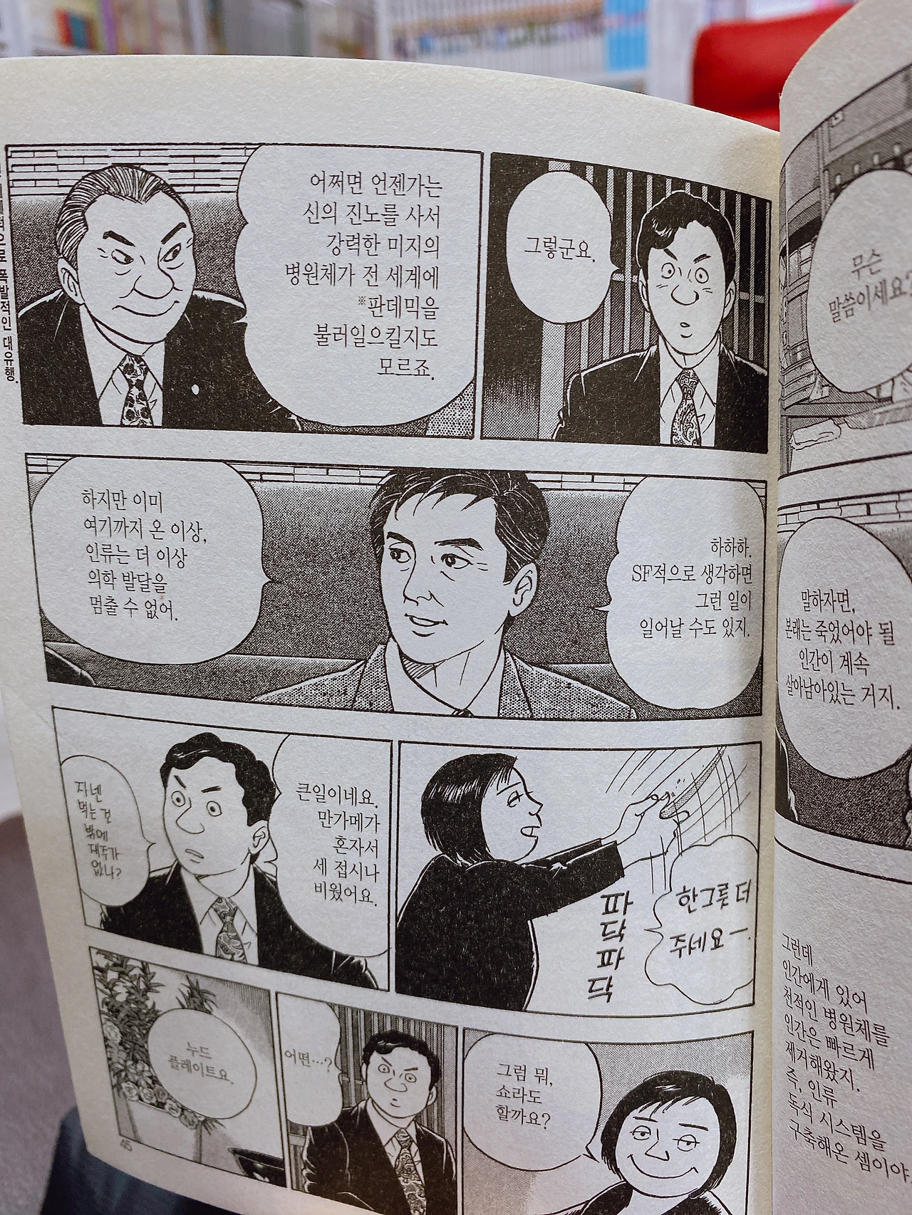사원 시마는 어느 덧 회장이 되었다. 처음 시마를 알게 된 건 시마 과장일 때 였는데. 2016년 출간된 시마회장 4권에서는 코로나의 가능성을 제기하고 있다. “어쩌면 언젠가는 신의 진노를 사서 강력한 미지의 병원체가 전 세계에 판데믹을 불러 일으킬지도 모르죠.” - 시마회장 4권#시마회장 #만화 #만화책 #코로나19