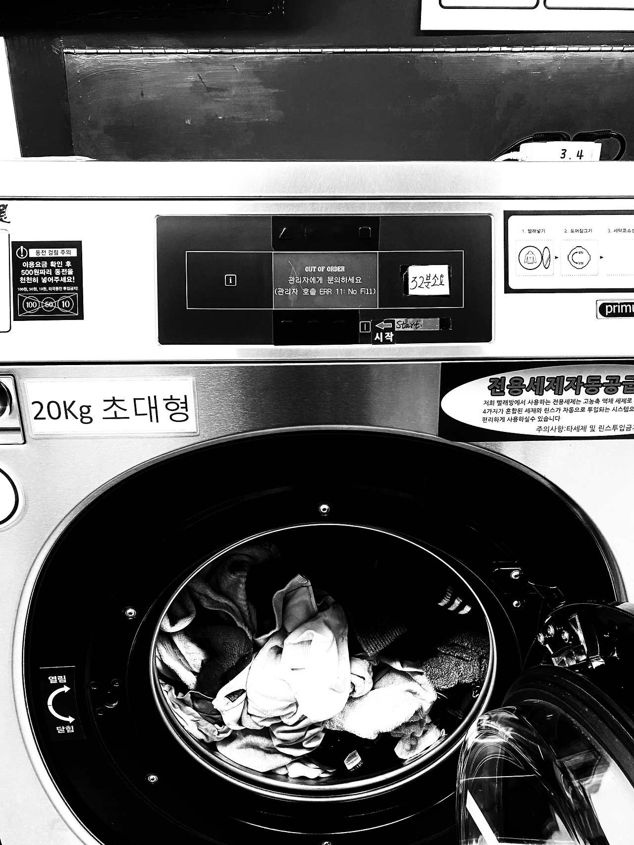 이른 새벽 잠에서 깼다. 창문을 열었는데 세찬 바람에 잠이 달아났다. 잠시 바깥 풍경을 보는데 모든 것이 얼어 있었다. 일찍 일어난 김에 뭔가 의미 있는 걸 하고 싶었다. 그래서 간 곳이 빨래방. 최근 생긴 곳이라 기계가 새것이었는데 고장 표시가 떴다.