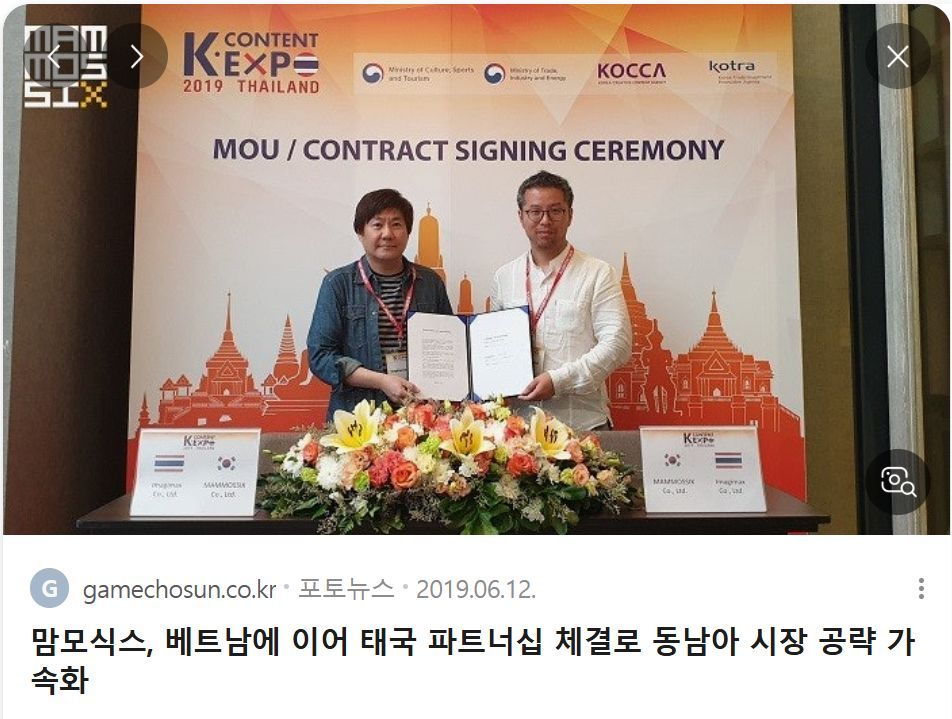 그날의 MOU 체결 소식은 곧 여러 미디어를 통해 보도되었다. 기사화가 되면서 '맘모식스'라는 이름에 태국이라는 연관 검색어가 처음으로 등장했다. 작은 규모의 회사로서는 꽤 의미 있는 기록을 남긴 셈이다. 무엇보다 개인적으로 깊이 와닿았던 점은, 친구이자 대표이사에게 '제2의 고향'이라 불리는 이 나라에서 새로운 인연의 끈을 이어주었다는 사실이었다. 제 2의 고향땅에 든든한 파트너를 만들었다는 것만으로도 이번 출장의 가치는 충분했다.