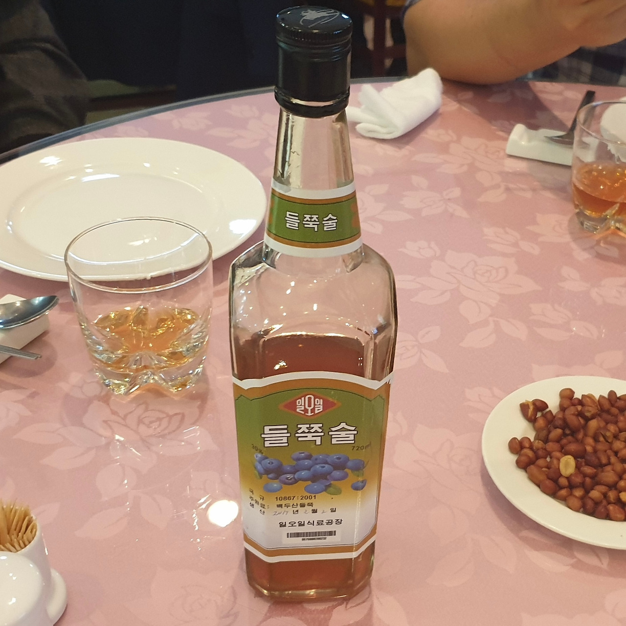 송이버섯과 더덕구이 같은 정갈한 안주를 시키고, 북한의 대표 술인 ‘들쭉술’을 주문했다. 과일주라는 이름에 속아 가볍게 한 모금 들이켰다가 눈이 번쩍 뜨였다. 이건 과일주가 아니라 거의 위스키급의 강렬한 타격감이었다. 목을 타고 내려가는 뜨거운 기운과 함께 취기가 로켓처럼 올라왔다.