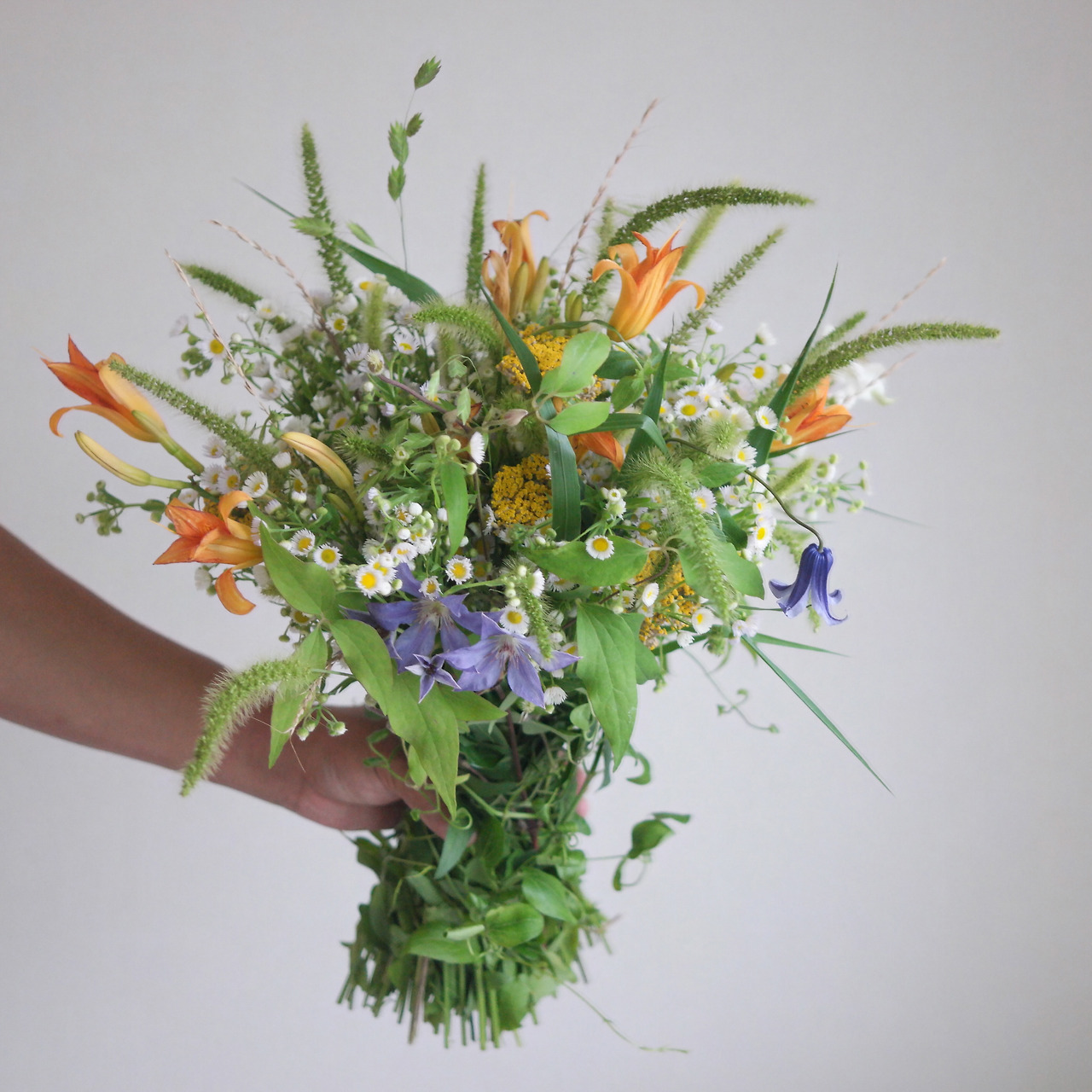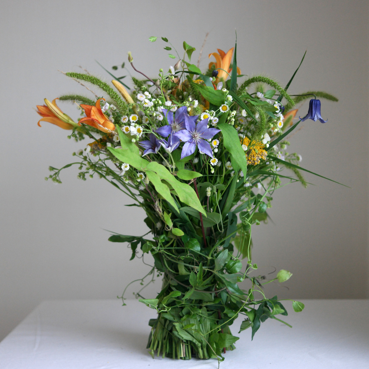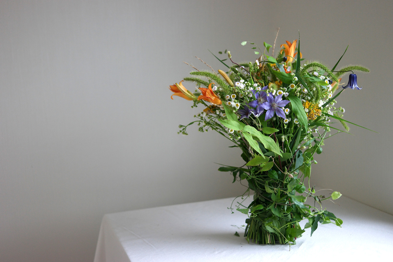 동네 공터에 원추리가 피기 시작했다. 개망초도 한창이다. 장마가 지나고 나면 수크령과 부처꽃이 피어날 것이다. 같은 시기에 핀 들꽃들은 어떻게 잡아도 서로 잘 어울린다. 잠깐 비가 그친 사이, 동네를 한바퀴 돌며 원추리와 개망초, 강아지풀을 잘라 왔다. 이름을 찾지 못한 덩굴 종류도 조금 잘랐다. 여기에 집에 남아 있던 클레마티스와 시계초를 더해서 부케를 만들었다.