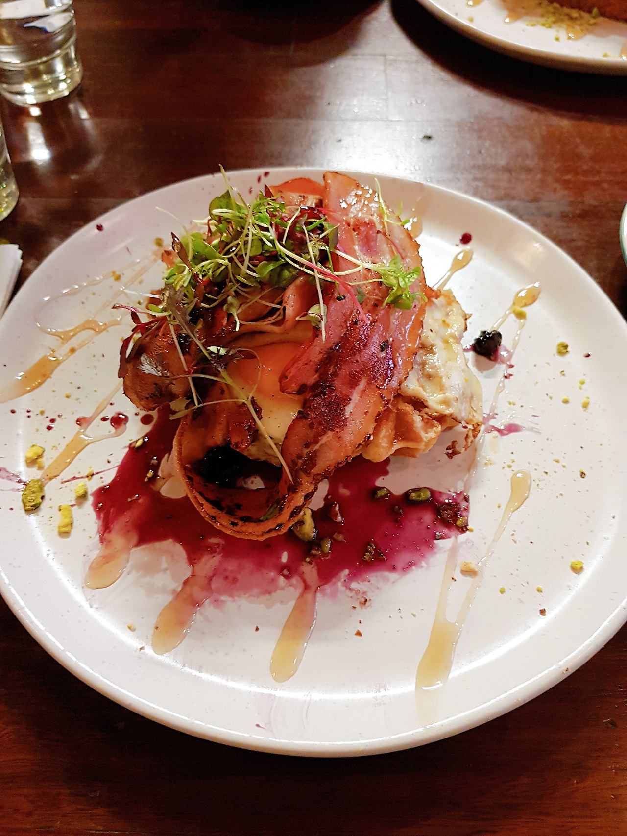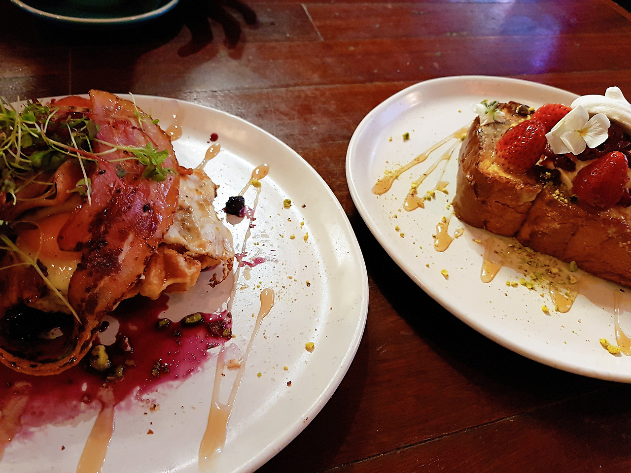 먼저 베이컨&와플. 벨기에 와플 위에 반숙 계란 후라이와 긴 베이컨 한 줄, 햄 슬라이스 두 개, 블루베리 잼과 메이플 시럽이 둘려 있었다. 그 외에 볶은 견과류도 뿌려져 있었는데 칼로 반숙 노른자를 톡, 찌르니 노른자가 천천히 흘러 와플 전체를 덮었다. 그 따뜻한 후라이에 베이컨, 잼과 시럽에 절인 와플을 잘라 먹으니 달달한 맛과 든든한 느낌이 입안이 가득하게 찬다. 식사라는 본분도 잊지 않은 듯, 넉넉한 와플양은 이제 슬슬 배가 부른다, 는 느낌이 들 때면 한 두 입 정도 남아 있었다.