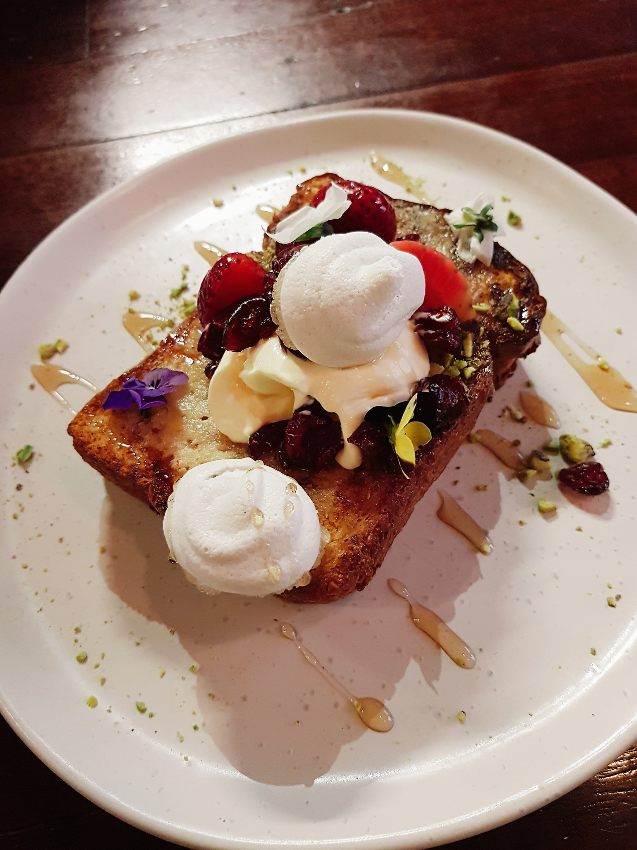 알라가 시킨 아몬드 프렌치토스트는 또 어떻고! 도톰하니 꿀에 절인 부드러운 프렌치토스트 위에 꽃이 두 송이 아담하게 피어있는 모습에 눈이 호강했다. 토스트 위에 계란 후라이 작은 것과 그 곁에 있는 생크림과 크랜베리, 딸기까지 옹기종기 놓여있었다. 개인적으로 빨갛고 보랏빛 꽃으로 플레이팅을 한 게 신의 한 수였다고 본다. 몇 번을 봐도 봐도 예쁘다!