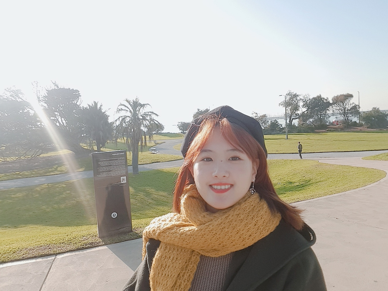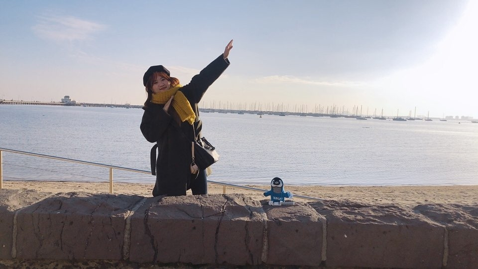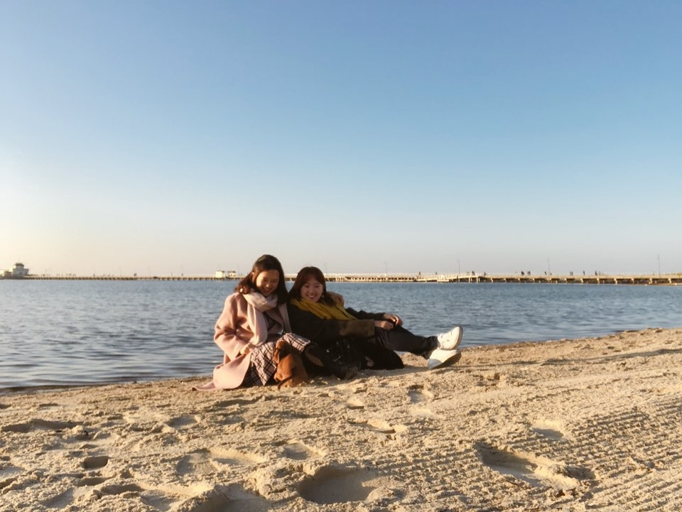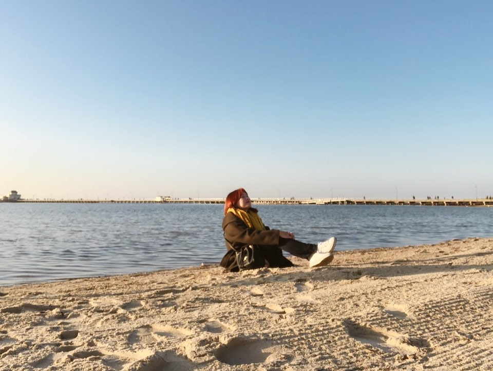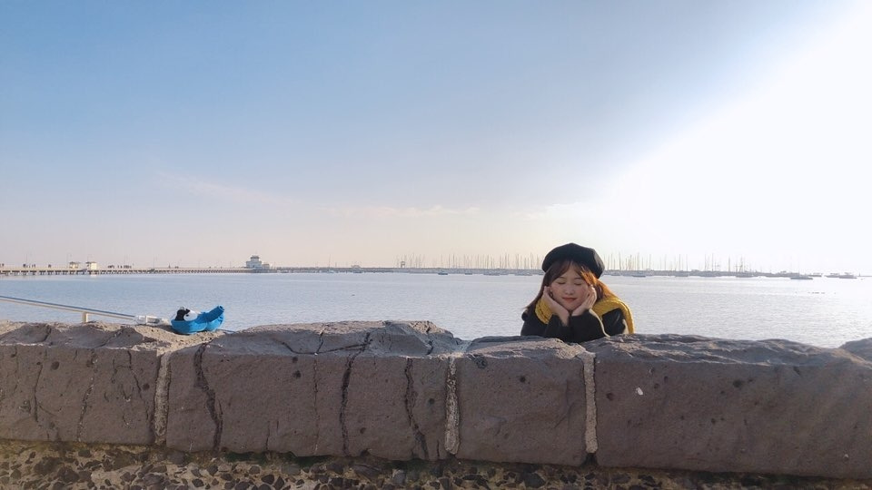 나는 바닷가 이미지를 떠올리면 백사장이나 노란 모래사장을 떠올리고는 했는데 세인트 킬다 바닷가는 그 옆에 카타니 공원에 있어서 그런가, 푸르른 잔디가 먼저 보였다. 모래사장과 맞닿아 있는 잔디밭. 그날의 옷과 햇살이 어우러진다 싶어 나의 모습을 사진으로 남겼고, 그 사진은 나의 호주 여행기 사진첩의 첫 번째를 장식한다.