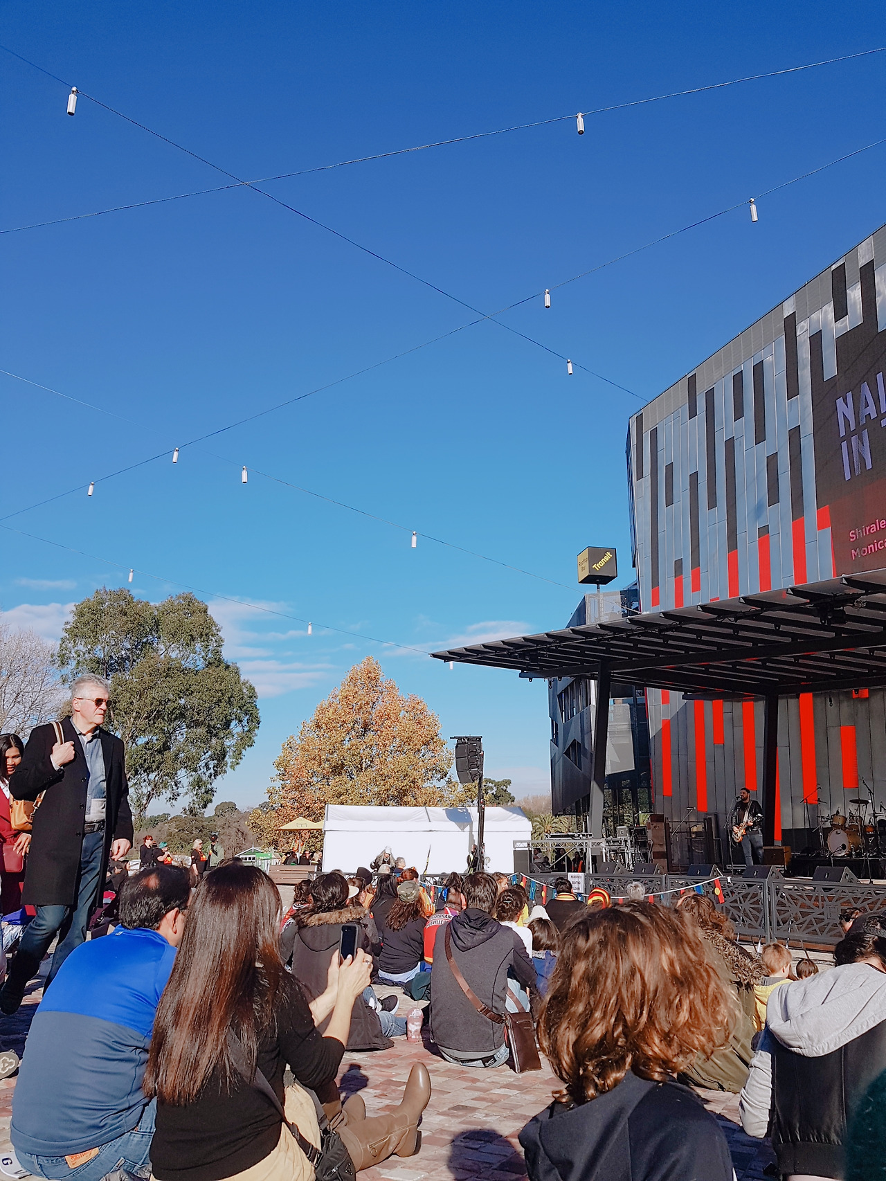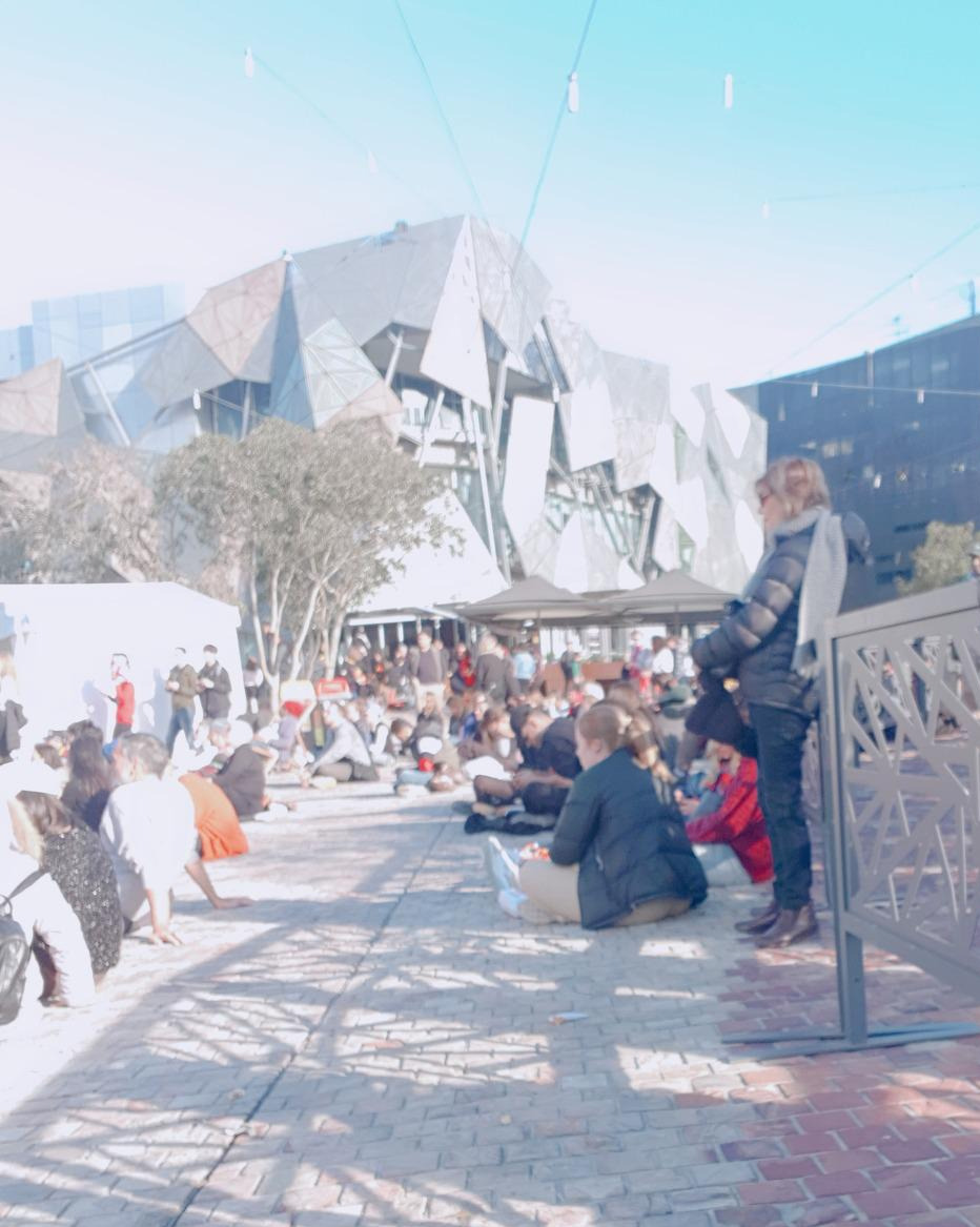 확실히 우리가 방문했던 첫날이 늦은 시간이 맞았던 건지, 점심에 다시 방문한 페더레이션 스퀘어에는 사람들이 무척 많았다. 붉고 하얀 벽돌이 광장 바닥을 가득하게 메웠고 한가운데 있는 공연장에서는 인디 밴드로 보이는 뮤지션들이 차례로 나와 노래를 불렀다. 콘서트는 딱 한 번 가본 적 있는 나로서는 굉장히 반가운 분위기였다! 광장이고 딱히 이렇다 할 자리는 없었지만 다들 바닥에 털썩 앉아서 구경하는 자유로운 분위기라 나와 알라도 적당한 구석에 앉아서 음악을 들었다. 이런 종류의 공연을 전혀 예상하지 못하고 구경한 경험이었는데, 이런 재미야말로 여행에서만 느낄 수 있는 점이라고 생각한다. 그런 면에서 우리는 참 운이 좋았지.