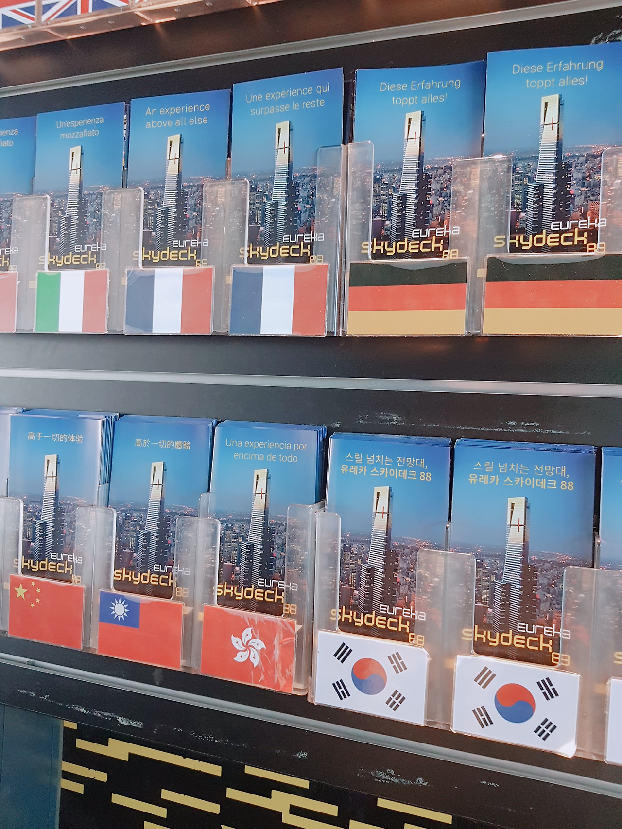 한참이나 말간 햇살을 받고 다시 천천히 오늘의 첫 목적지로 향하는 알라와 나는 유레카 스카이덱에 도착했다. 유레카 타워 안에 스카이덱 전망대에서 멜버른의 전경을 감상할 수 있기 때문이다. 유레카 타워는 호주에서 두 번째로 높은 빌딩이지만 전망대로만 본다면 스카이덱 전망대가 남반구 전역에서 가장 높다고 한다. 그리고 88층으로 올라가는 엘리베이터의 속도 역시 남반구에서 가장 빠르다고 한다.