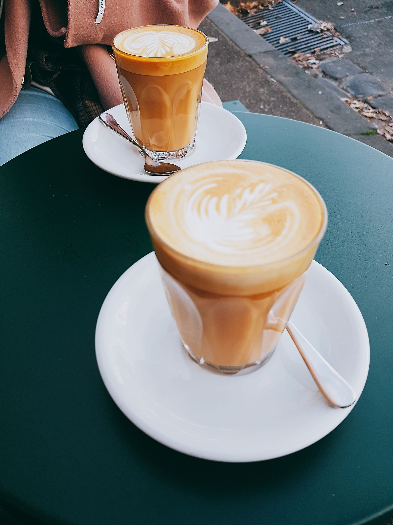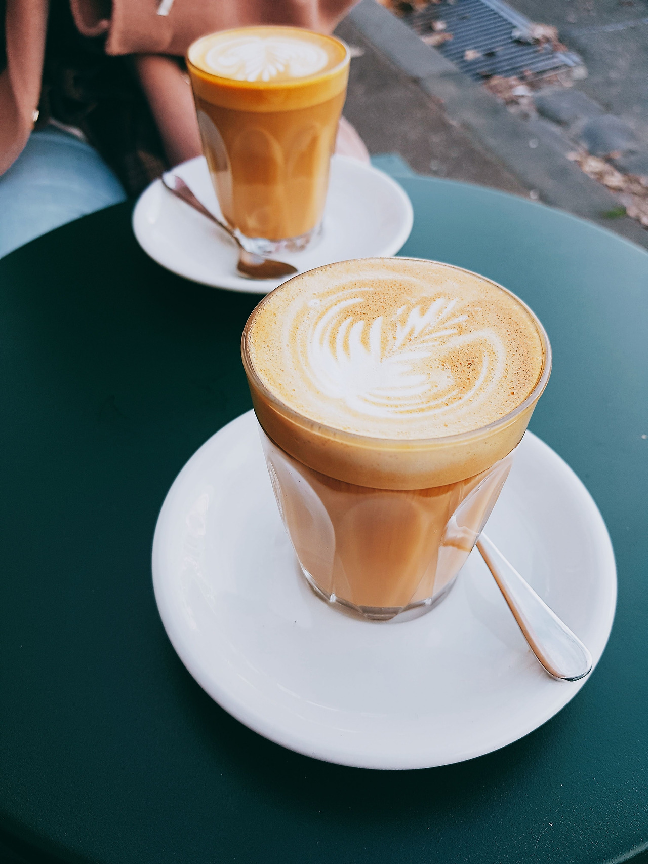 그렇게 청록색 테이블에 앉아 주문한 라떼를 놓고 보니 색 조합이 담백하고 비 올 때의 그것이라 운치 있었다. 톤 다운된 색깔이 주는 안정감이랄까. 생각해보라. 길에는 낙엽이 촘촘히 쌓였고 적당하게 구름이 낀 날씨에 코트를 걸치고 바람도 선선한 가을날 길거리 테이블에 앉아 마시는 따뜻한 라떼. 설정샷 같지만 내 호주 여행은 내내 설정이라도 한 듯한 멋이 있었다.