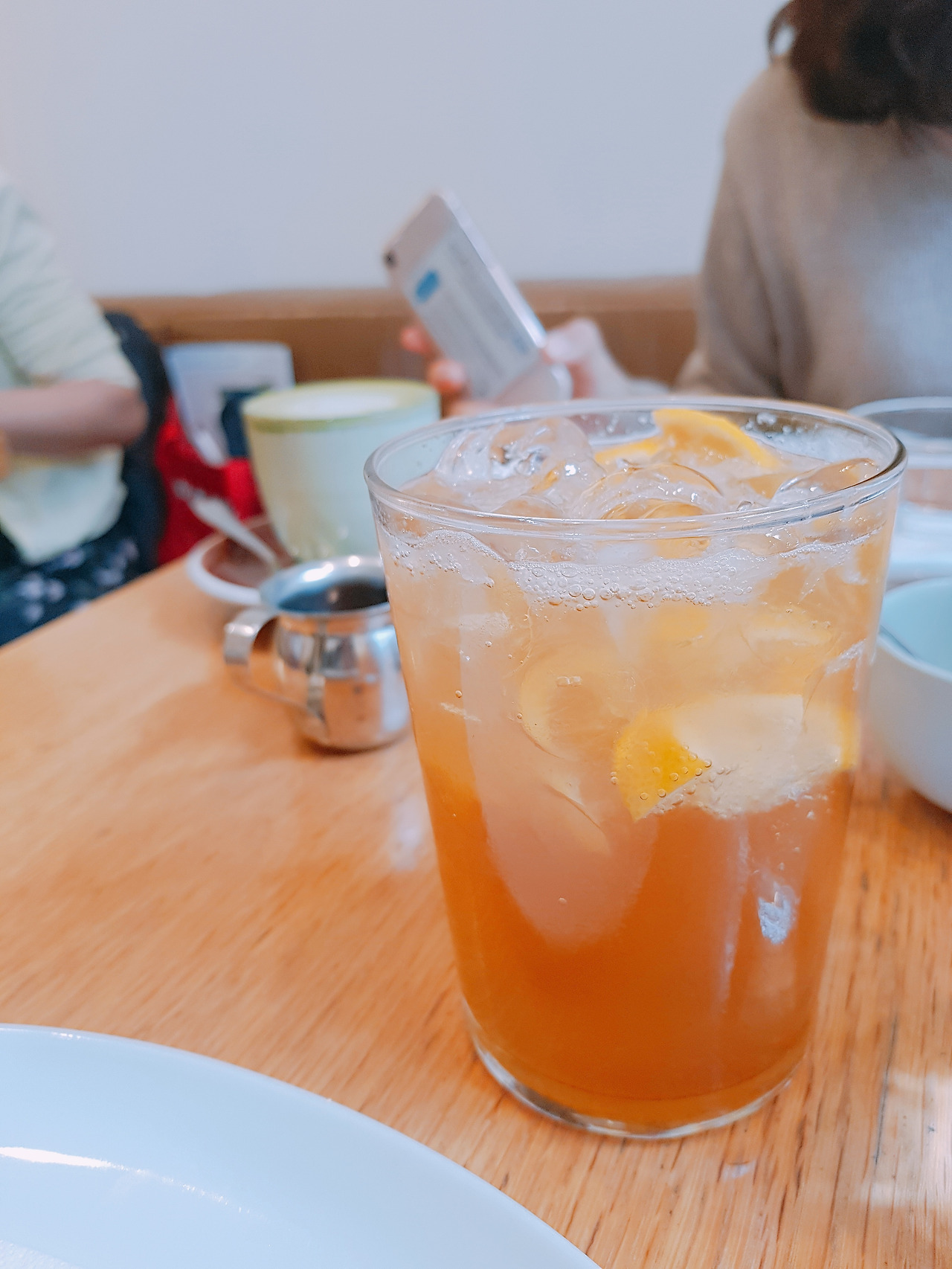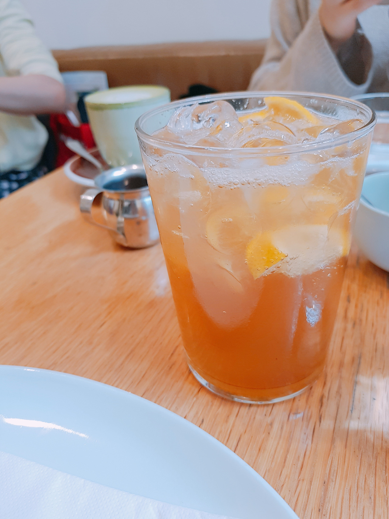 사진도 찍고 신나게 기다리다 보니 우리가 시킨 메뉴가 속속 세팅됐다. 음료가 먼저 나왔는데 내가 시킨 레모네이드는 내가 알던 레모네이드보다 무거운 느낌이었다. 에이드라고 하면 톡톡 쏘고 상큼하고 입안에 많이 달라붙지 않는 느낌인데 여기에서 시켜 마신 레몬에이드는 톡톡 쏘기도 하고 상큼하기도 하지만 음료가 입안에 달라붙는 느낌이 있어 무겁다고 생각됐다. 나야 맛있게 마셨지만 혹 입 안에 달라붙는 설탕 느낌을 싫어한다면 추천하지 않겠다. 알라가 시킨 말차 라떼는 누구나 알고 있는 말차 라떼 맛으로 한국 버전을 좋아한다면 다들 맛있게 마실 것 같다.
