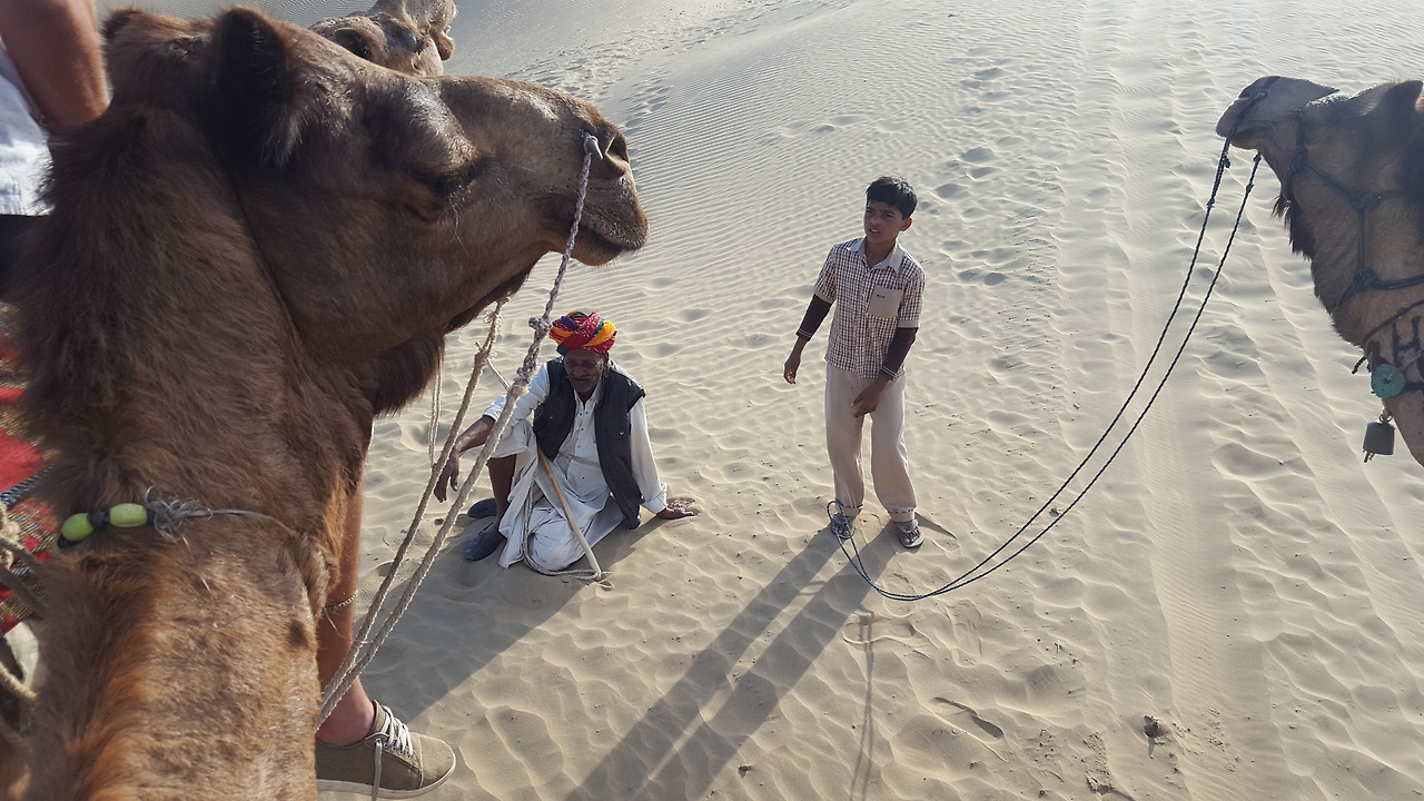사막에 해가 비치니 간 밤에 어디론가 가버린 낙타들이 다시 돌아와 있었다. 오리털 파카에 침낭까지 둘러쓰고도 추워서 바들거렸는데 추운 몸을 웅크리고 있는 아이를 보고 가슴이 아팠다. 인도의 라자스탄을 여행하면서 사막 사파리를 건너뛸 수 없다. 사막에서의 하룻밤이 빼놓을 수 없는 여행상품이 되었다. 그런데, 일이 많아지니 이곳에 있는 아이들은 학교에 갈 시간 없이 부모를 도와 일을 하고 있었다. 그냥 아무 생각 없이 놀러 왔다가 조금 착잡한 마음으로 고생한 아이 어깨 한번 토닥거리고 부모 몰래 용돈을 쥐어 주었다. 두 번 다시는 사막에서 자지 않으리라는 마음을 다지고 어젯밤 잠투정한 일이 있었는지 모르게 다시 돌아온 가지네 호텔에 간사한 마음을 드러냈다. 하마터면, 집에 오니 좋다고 말할 뻔했다.