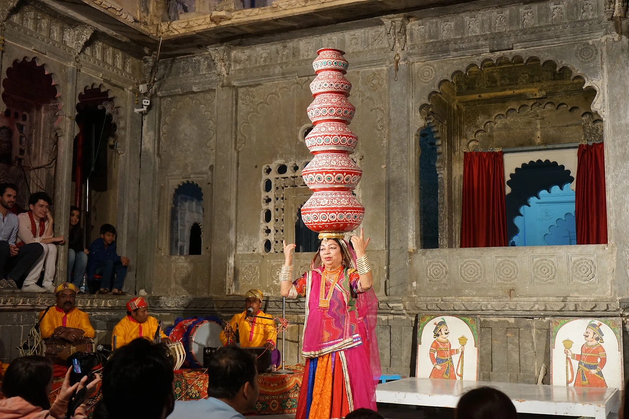 ’바고르 키 하벨리‘는 18세기 말 당대의 세도가이자, 메와르 왕조에서 수상을 역임했던 ’아미르 찬드 바드와‘가 지은 대저택이다. 저택 이라기보다 궁전에 가까운 규모로 무려 138개의 방과 부속 정원이 딸려있었다. 지금은 주간에는 박물관, 야간에는 민속공연장으로 쓰이고 있었다. 저녁 7시에 시작하는 민속공연을 보기 위해 저녁밥도 반납하고 입장해 부속정원의 좋은 자리에 자리를 잡았다.