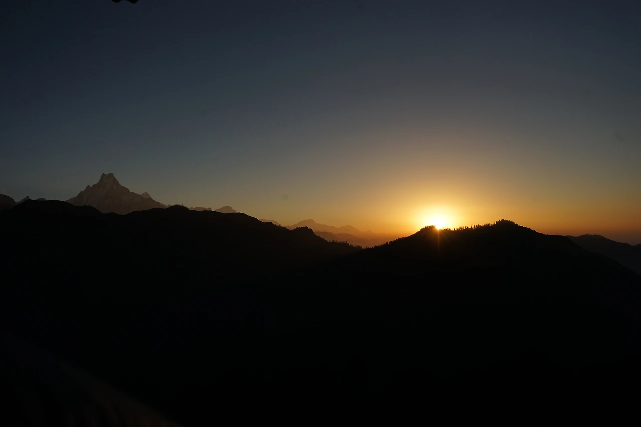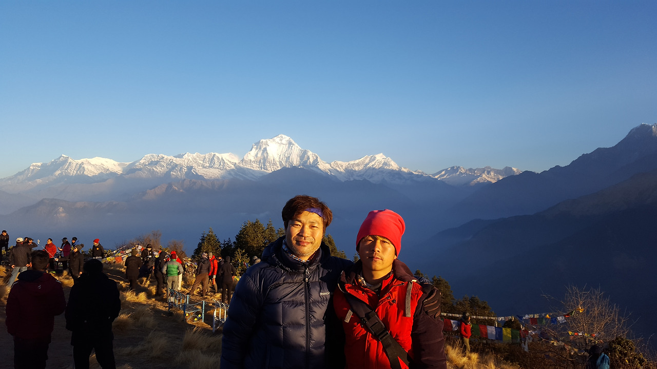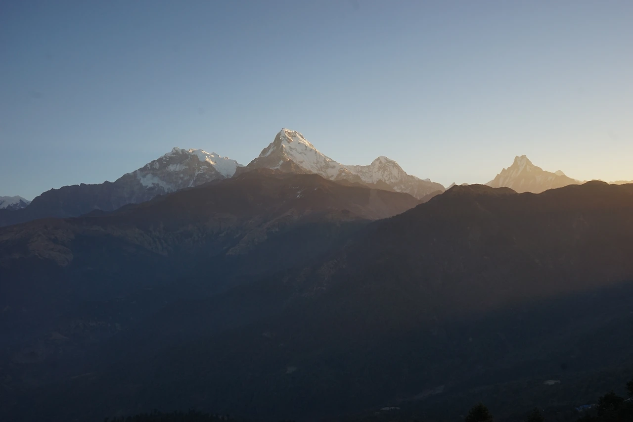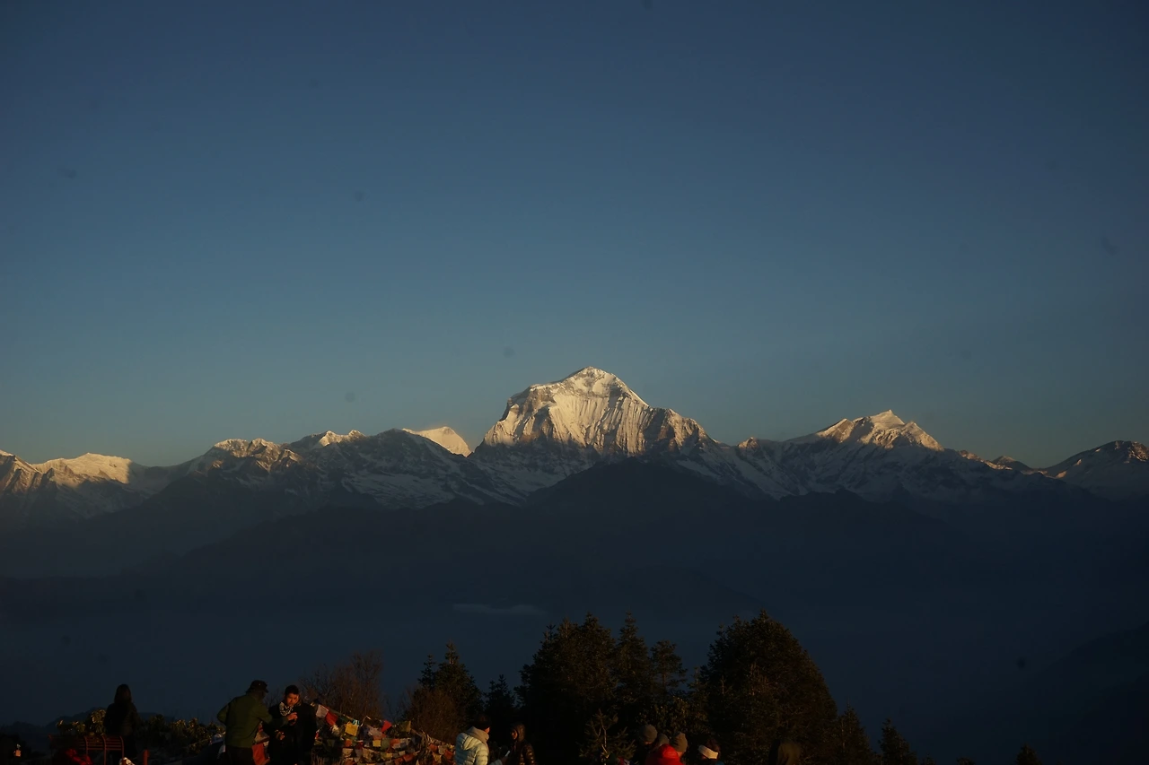 푼힐이라고 쓰인 푯말이 보이고 고개를 들어보니 망루가 서있었다. 망루를 주위로 푼힐에 이미 도착한 많은 사람들이 모두 한 곳을 바라보고 있었다. 히말라야의 준봉들이 파노라마처럼 펼쳐졌다. 해뜨기 전의 여명이 히말라야를 짙은 흑색에서 옅은 회색빛으로 묽게 만들었다. 다울라기리, 안나푸르나 남봉, 힘 출리, 마차푸차레가 막힘없이 나란히 서있었다.
