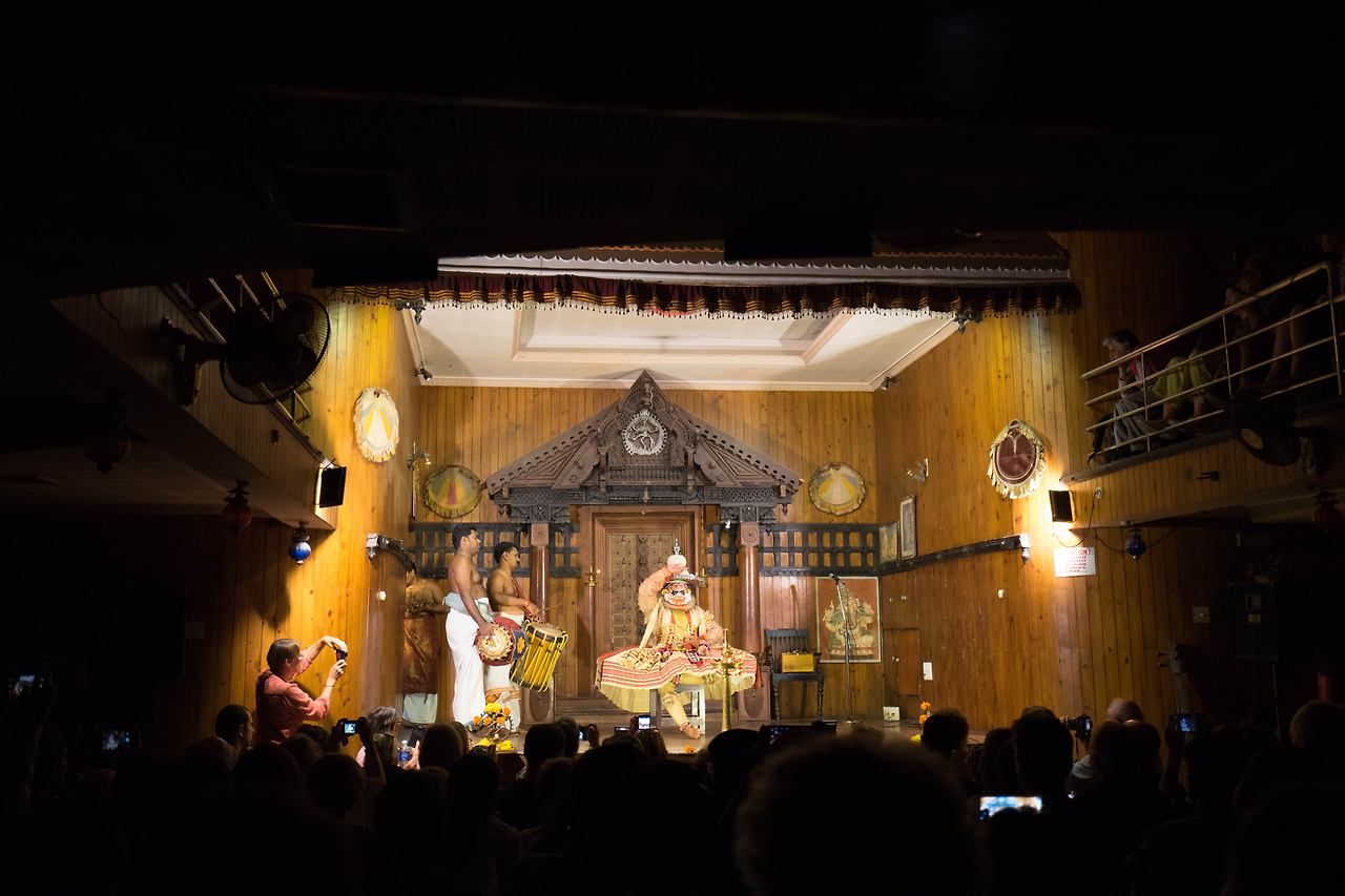 카타칼리 공연을 보러 갔다. 이야기를 뜻하는 ‘카타(Katha)’ 놀이를 뜻하는 ‘칼리(Kali)의 합성어로 '이야기 놀이판'이다. 인도 남부의 케랄라에서 500년 전에 시작되어 중국 경극에 영향을 주었다. 카타칼리 공연의 분장에 다섯 시간 정도가 걸린다고 한다. 배우들이 분장하는 모습부터 보여주었다. 분장을 다 마친 배우가 자그마한 무대에 섰다. 원색의 분장과 의상에 몰두하지 않을 수 없었다.