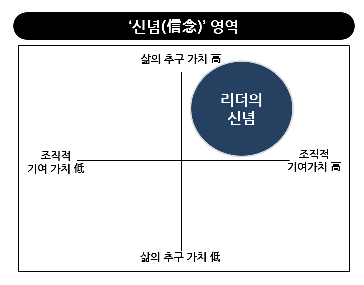리더의 신념은 어떻게 찾아야 할까? 그 답은 두 가지 관점에서 접근하여 공통분모를 찾는 것이 필요하다. 하나는 개인적으로 추가하는 삶의 가치이고, 다른 하나는 조직과 사회에 기여하는 가치다. 리더는 기업의 지속경영을 위해 성과를 창출해서 기여해야 하는 의무를 가진 사람이다. 그렇기 때문에 개인적인 삶의 가치만을 추구하여 ‘조직이 무슨 상관이야, 나만 잘 살면 되지’라는 식의 행동으로 조직과 회사에 물의를 일으켜선 안 된다. 리더의 신념은 개인과 조직 모두에 긍정적인 영향을 미칠 수 있는 가치여야 하는 이유가 여기에 있다.