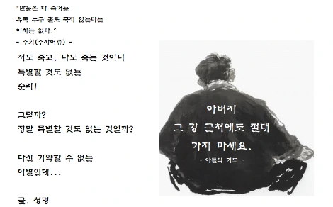 하나하나 떠올리다, 눈가가 적고, 어느 사이 볼을 타고 흐르는 한줄기 눈물의 정체는 나도 언젠가는 친구처럼 아버지를 보내드려야 할지도 모른다는 두려움과 슬픔이었다.