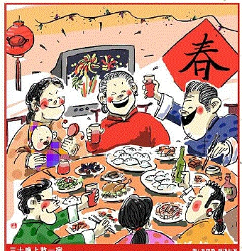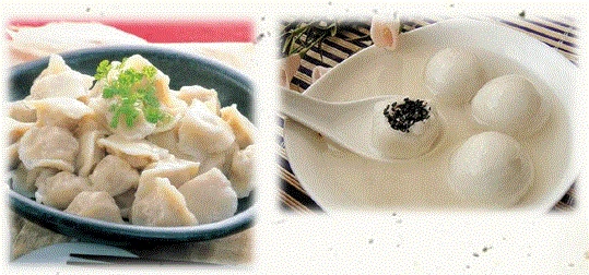 중국사람들은 그믐날 밤과 새해 첫날에(자시子時: 11시 -1시) 교자(餃子) 즉 만두를 먹는다. 교자는 "갱세교자(更歲交子)"라는 말에서 왔는데 갱세교자는 해가 바뀌는 자시(子時)라는 의미가 있다. 사람들은 교자를 그믐날 저녁 만들었다가 자시가 되면 먹기 때문이다. 북방 사람들은 만두를 빚는데 원보(元寶, 옛날 금이나 은으로 만들어진 화폐) 모양으로 둥글게 빚는다. 남방 사람들은 니앤까오(年糕, 설떡), 쫑즈(粽子: 찹쌀을 대나무 잎사귀나 갈대 잎에 싸서 삼각형으로 묶은 후 찐 음식), 혹은 탕위안(湯圓:찹쌀가루 등을 새알 모양으로 빚은 것으로 대부분 소를 넣어 만듦. 또는 이것을 넣고 끓인 음식)을 만든다. 남방은 지역마다 풍속이 다르다. 설떡을 의미하는 니앤까오(年糕)는 매년 높아진다는 니엔까오(年高)와 발음이 같다. 탕위안(汤圆)도 행복과 길상을 상징한다.