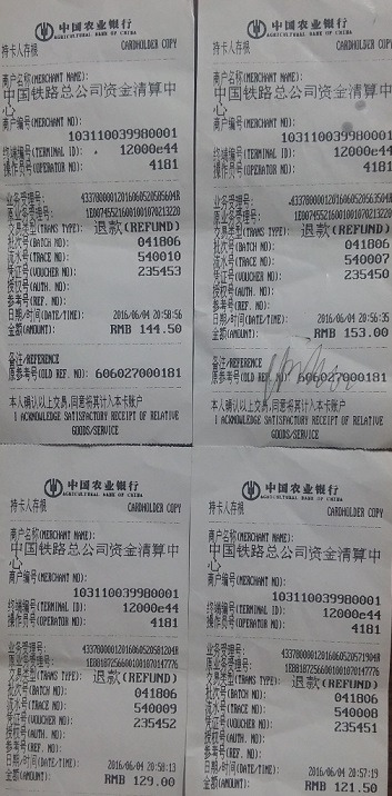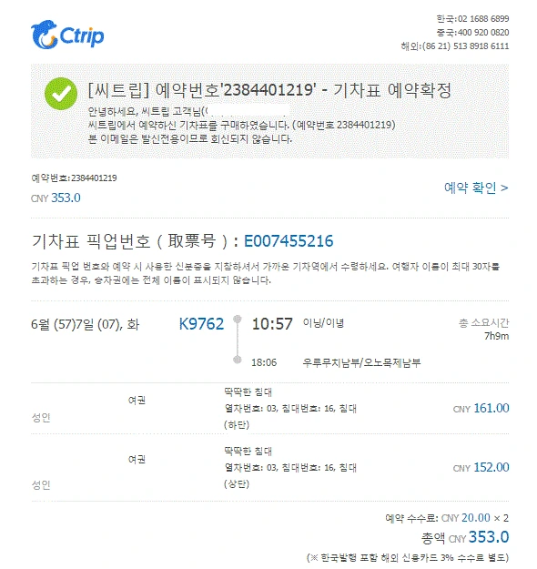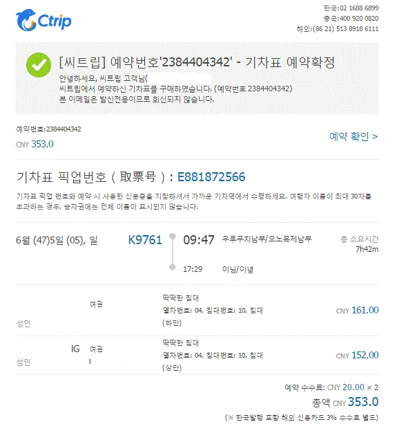 씨트립을 통해 기차표를 예매하면 한 장에 20위안의 수수료가 부가됩니다. 신용카드로 결제할 경우에는 3%의 카드 수수료가 추가됩니다. 하지만 한글 버전 모바일앱에서 예매할 수 있어 편리합니다.