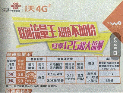 - 월정액 38위안/월, 신장 성내 데이터 사용량 6G 포함(3G는 1:00 - 9:00만 사용 가능)