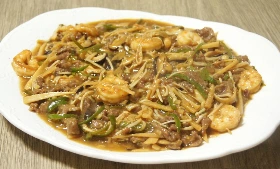 돼지고기와 파등 세 가지 재료를 실처럼 길쭉하게 썰어서 녹말가루를 넣고 볶은 것