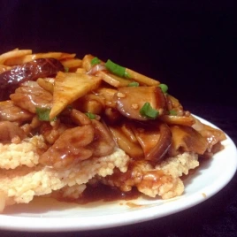 누룽지와 고기 위에 양념 소스를 뿌린 음식