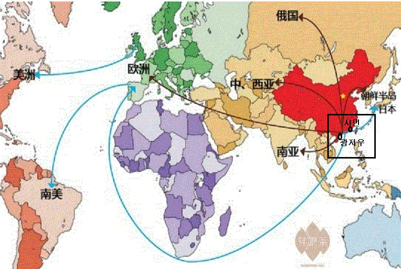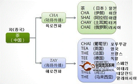 중국은 차의 원산지이다. 세계에서 가장 먼저 차나무를 발견하고 차를 마신 나라이다. 중국의 차는 육로와 해로를 통해 세계 주요 지역으로 전파되었다. 육로로 전파된 지역의 '차'의 이름은 광둥어의 ‘cha’에서 유래하였다. 당시 차는 광둥 지방에서 집산되어 실크로드를 거쳐 중앙아시아로 전파되었기 때문이다. 맨 처음 차를 수입한 유럽 국가는 포르투갈이었다. 포르투갈 선원들은 당시 광저우 상인들과 거래하였다. 그래서 포르투갈 발음도 “chai”이다.