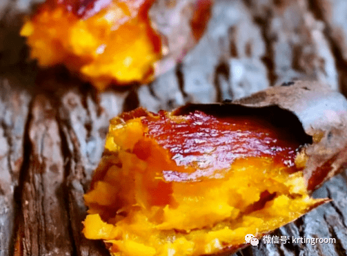一口咬在烤酥烂、泛甜味、金黄灿烂的烘山芋上,