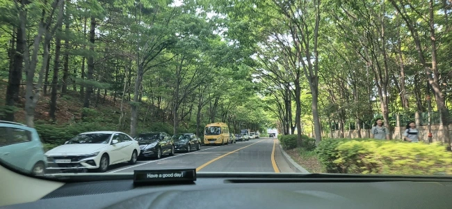 초여름 아침 햇살에 연초록 나뭇잎에 달린 이슬들이 윤슬처럼 빛나고 있어요. 제가 사는 곳은 나무가 아주 많은 동네입니다. 저 아래쪽 마을어귀부터 쭉 늘어서 있는 가로수는 또 그 잎이 얼마나 실하던지 길 양쪽으로 우뚝 선 나무들이 하늘을 다 가리고 있는 모습은 꼭 밀림 속 둥근 터널 같이 울창하답니다. 그래서 초여름부터 몇 달 동안은 한낮에도 라이트를 켜고 운전을 해야 되는 곳이고요.