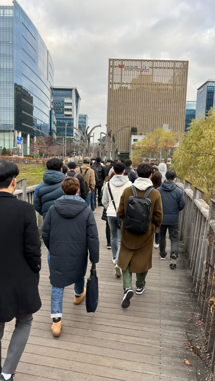 판교테크노밸리로 출근하는 많은 IT인력들이 아침이면 판교역 출구로 나와서 테크노밸리까지 걸어하는 길이 있다. 여러해 전에(아마 프로젝트를 끝내고 잠시 몇일 쉬는 기간이었을꺼다), 이 출근 행렬들을 보면서 '아 부럽네..'하고 지켜보던 때가 기억이 났다. 그리고 난 요즘 그 행렬에 같이 출근을 하고 있다.