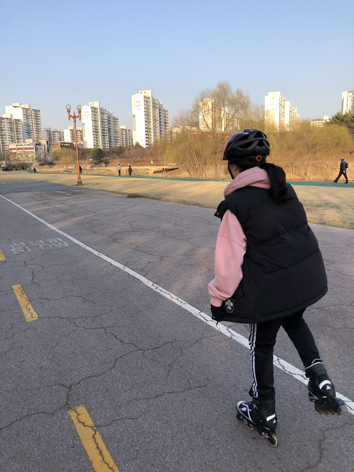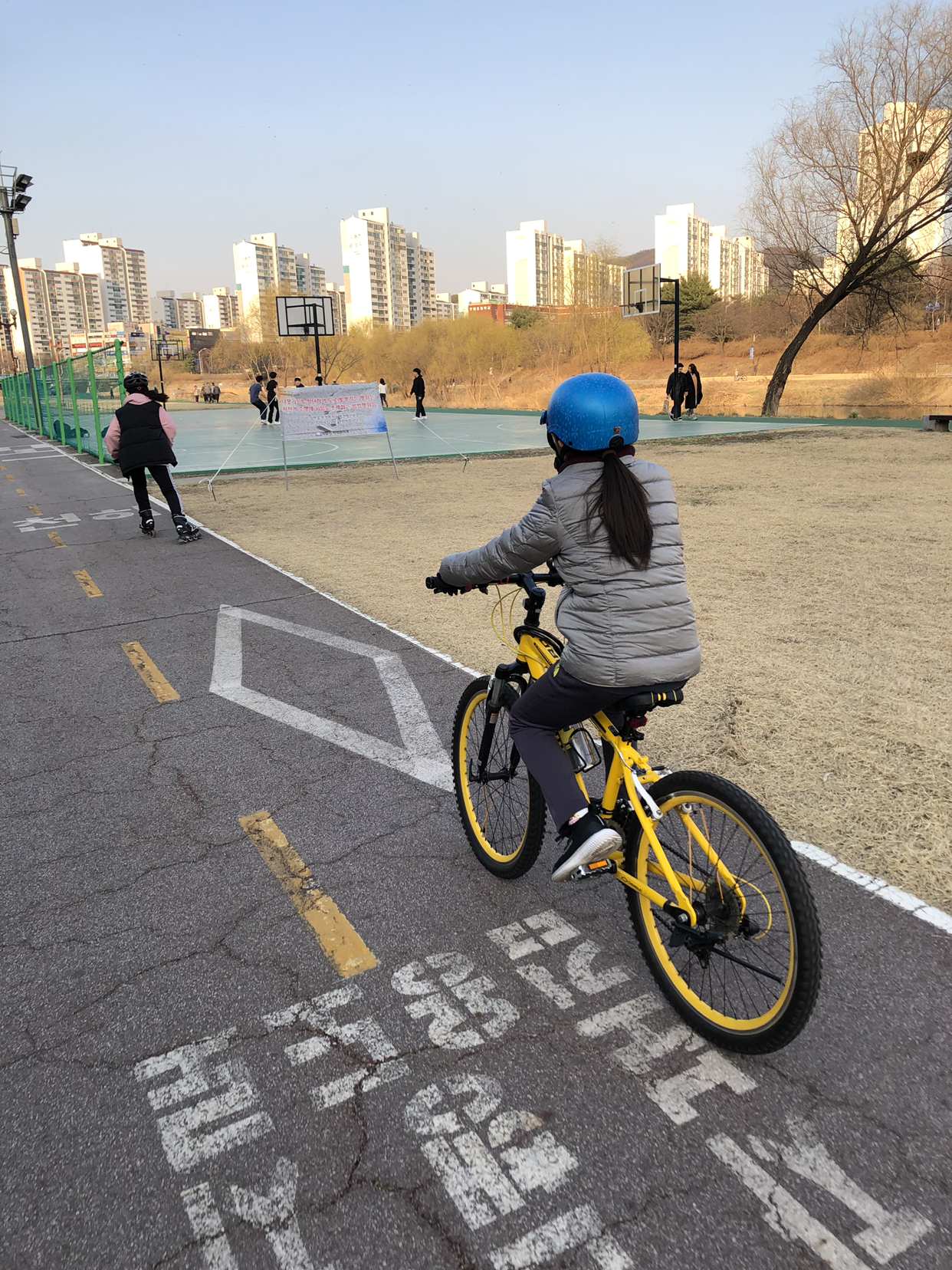 작은 아이는 자전거를 타고, 큰 아이는 인라인 스케이트를 타고 힘차게 쫓아온다.