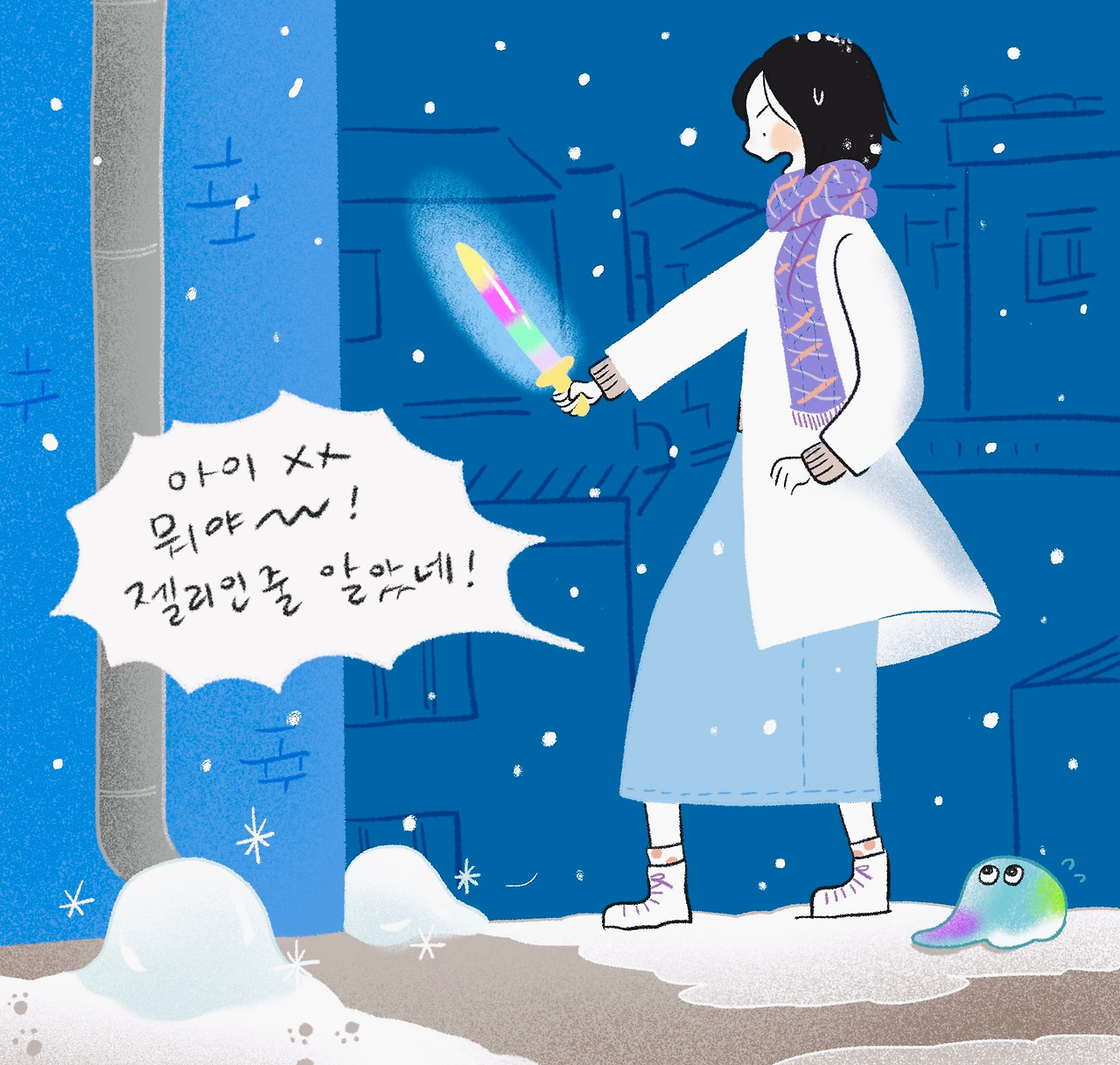 칼을 윙 뽑았다가 “아 뭐야 ₩&@! 젤리인 줄 알았네” 투덜대며 돌아서는 안은영이 눈앞에 보이는 듯 했다.