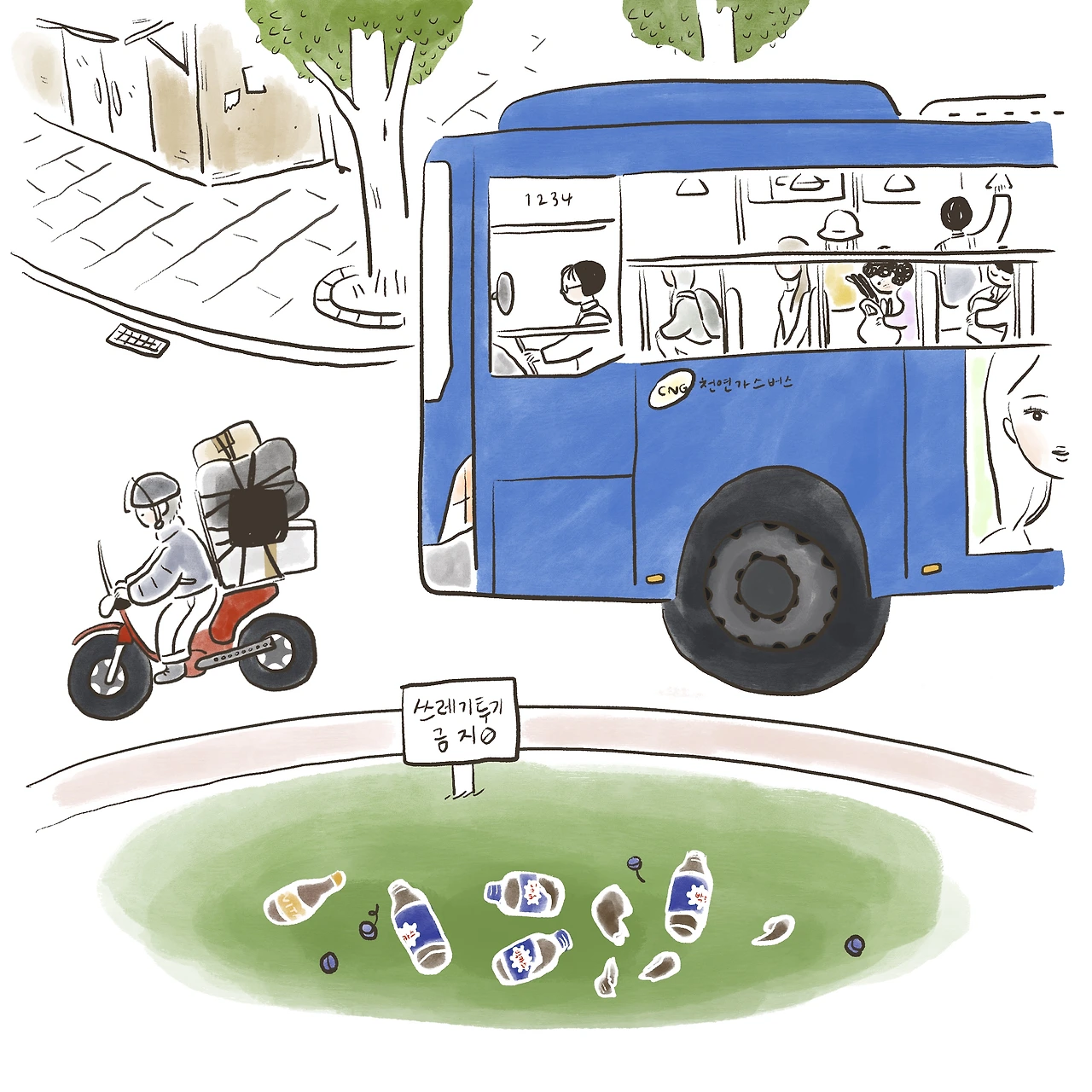 표지판 내용이 무색하게 박카스 병이 잔뜩 버려져 있다.