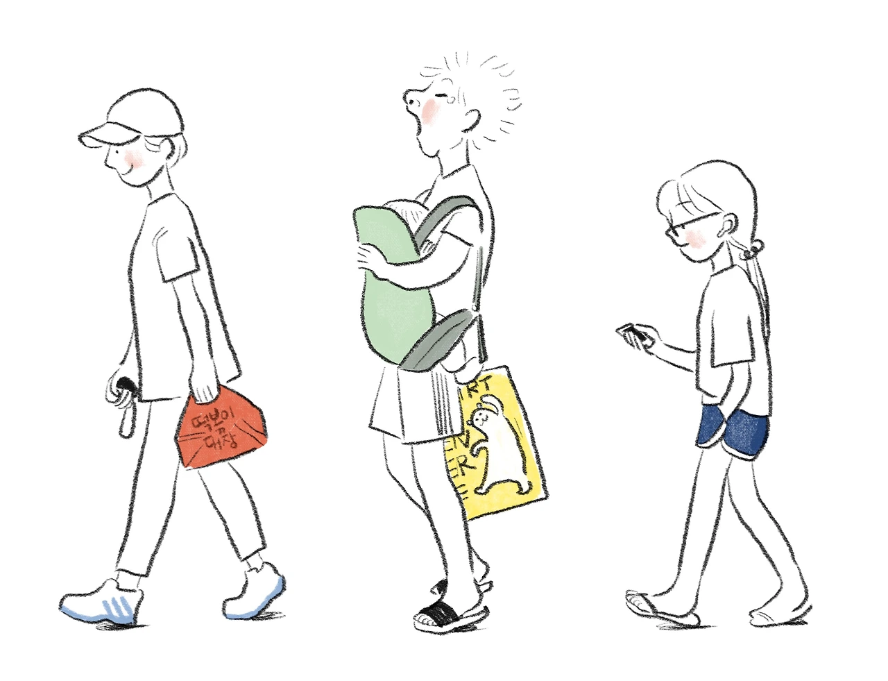티셔츠에 레깅스, 슬리퍼 차림의 사람들이 느리게 걸어간다.