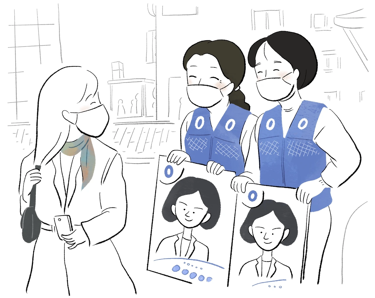 퇴근길 역 앞, 선거운동을 하는 아주머니들이 한 목소리로 외친다.