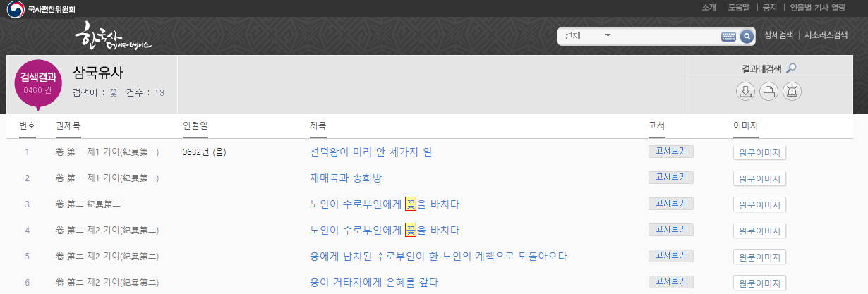 데이터베이스 검색 "꽃" -> 삼국유사 (건수 19) 검색 내용
