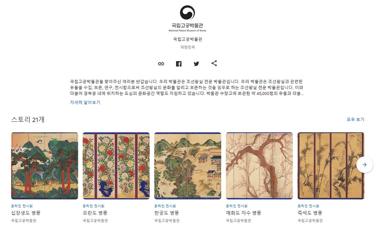 “구글 아트앤컬쳐“는 전 세계 문화재를 온라인으로 제공하기 위해 구글의 컬처럴 인스티튜트(Google Cultural Institute)가 개발한 웹사이트와 앱이다. 세계 각국의 박물관들이 사진 자료와 기획물을 구글 기술을 통해 제공한다. 우리나라 문화재뿐만 아니라 전 세계 박물관 컬렉션을 이 사이트 통해서 찾으면 좋다. 우리나라는 구글의 사용도가 비교적 떨어지니 등록되어 있는 기관마다 올리는 기획물 양의 편차가 좀 있는 것 같은데, 그럼에도 불구하고 정말 큰 장점은 바로 초고화질로 제공되는 사진이라 생각한다. 박물관 홈페이지에서도 소장 유물의 고화질 사진을 찾기가 힘든데, 이 곳에선 구글 검색으로 정확하게 찾을 수 있다. 가로 8m가량 되는 창덕궁 희정당의 부벽화도 김규진의 필선 하나하나 확인할 수 있을 정도의 화질로 국립고궁박물관 아트앤컬쳐 사이트에 올라와 있다.