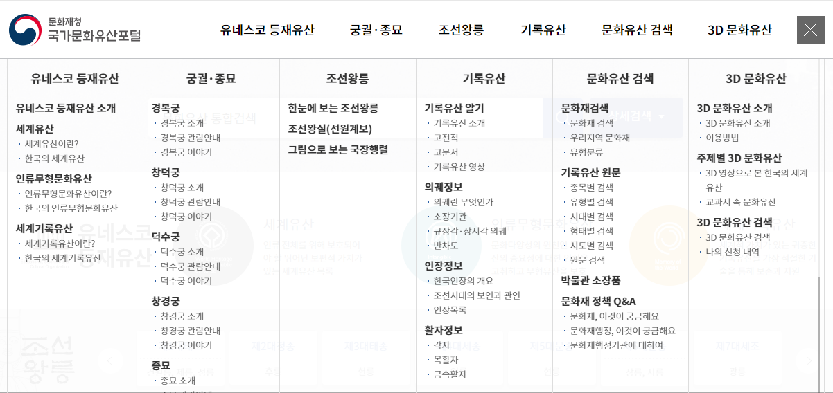 문화재청에서 운영하는, 문화재청이 관리/ 감독하는 문화재들을 검색하고 관련 자료를 열람할 수 있는 사이트다. 특히 조선시대 왕릉, 궁궐, 그리고 왕가에 대한 내용이 풍부하다. 3D로 스캔한 문화유산, 그리고 3D로 프린트할 수 있는 자료 파일도 다운로드할 수 있다. 교육물로 쓰기 좋을 것 같다. 자료뿐만 아니라 대상에 대한 설명도 친절하게 되어 있어 심심할 때 둘러보기도 좋다. 참고로 국가무형문화재는 영상과 사진물로도 다 기록을 남기는데, 이는 무형유산원 디지털 아카이브에서 보는 게 더 편하다.