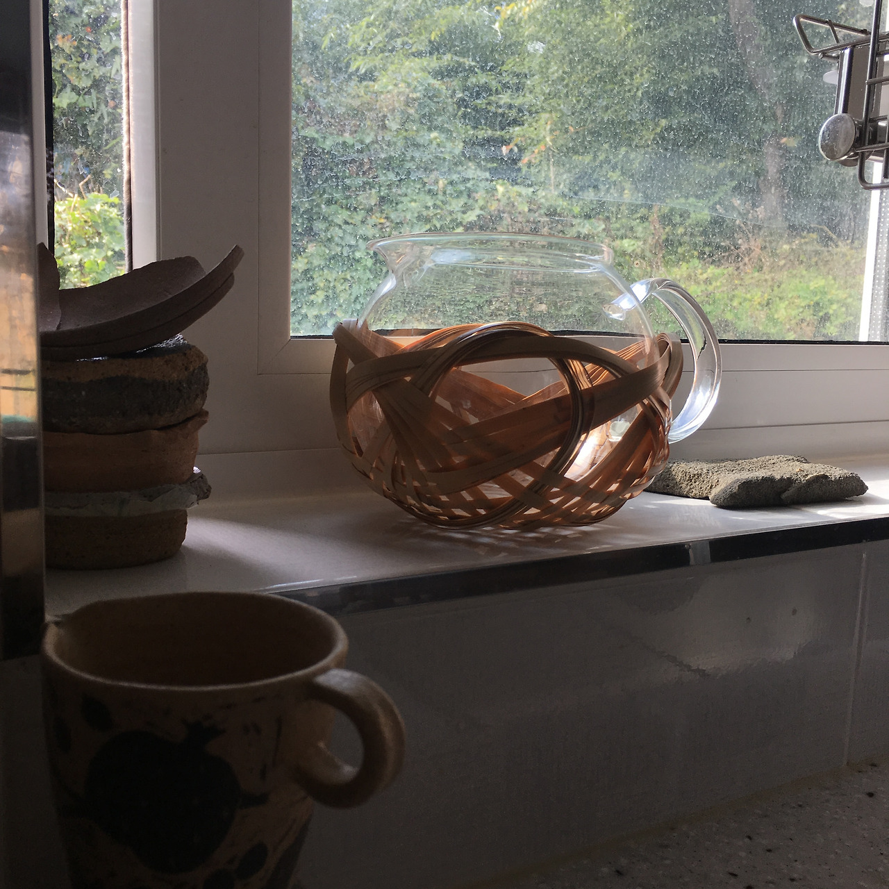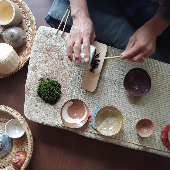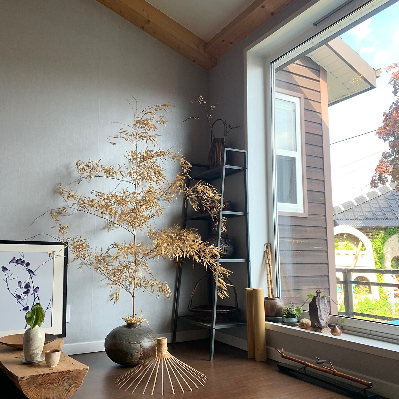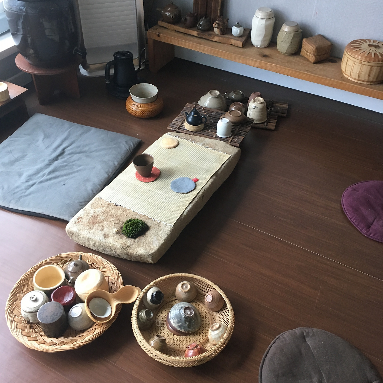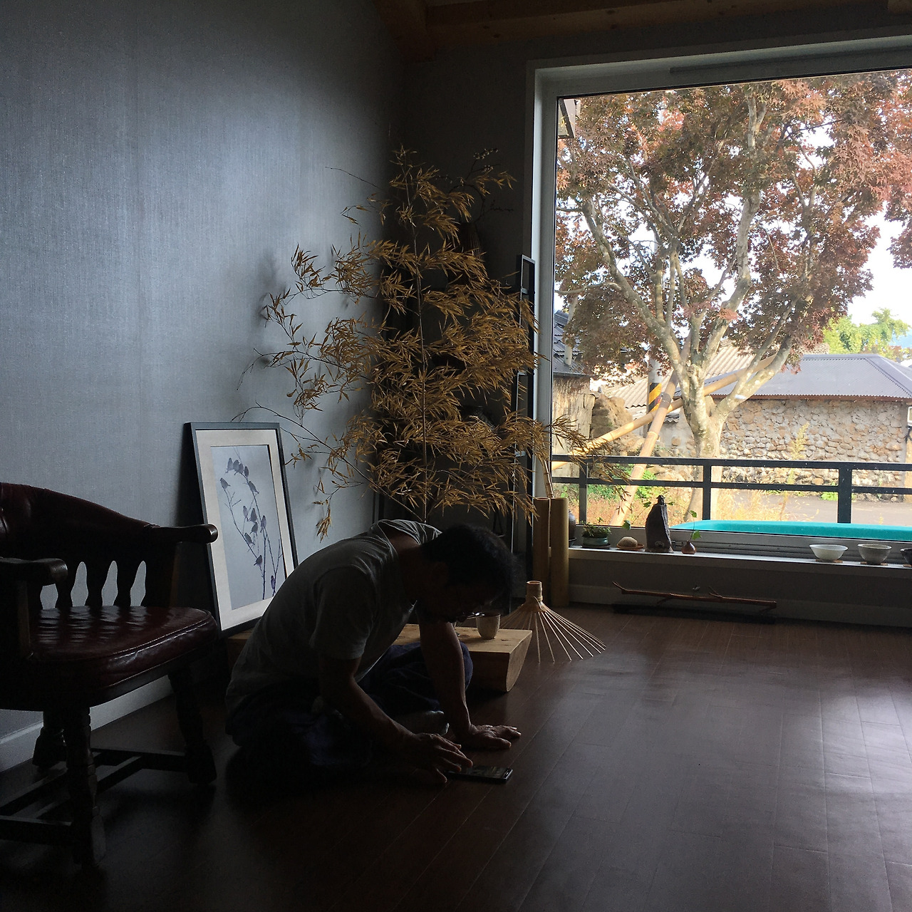 작은 가정집을 개조하신 선생님 공방은 너무 아름다웠습니다. 만드신 죽공예 작품들이 알맞게 찬장과 벽, 바닥에 놓여있었습니다. 한쪽 벽을 가득 채운 창문 밖으로 동네 모습이 보였고, 그 앞엔 차를 대접하고 마시기 위한 작은 돌 탁상과 차 도구가 있었습니다.
