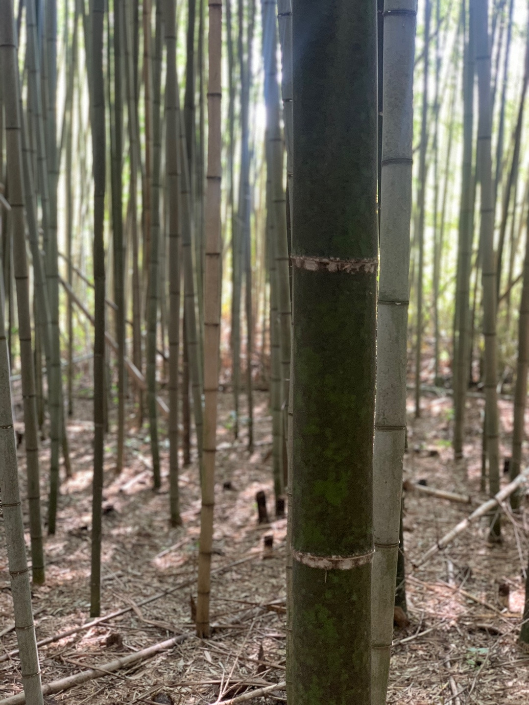 세로로 뻗은 대나무가 높이, 그리고 깊이 사방을 에워쌉니다. 15m가량 위에 있는 댓잎이 서로 엮이며 수풀 바닥에 스포트라이트를 만들고 없앱니다. 바람이 불면 저 멀리에서부터 소리가 넘어와 머리 위로 휘몰아칩니다.