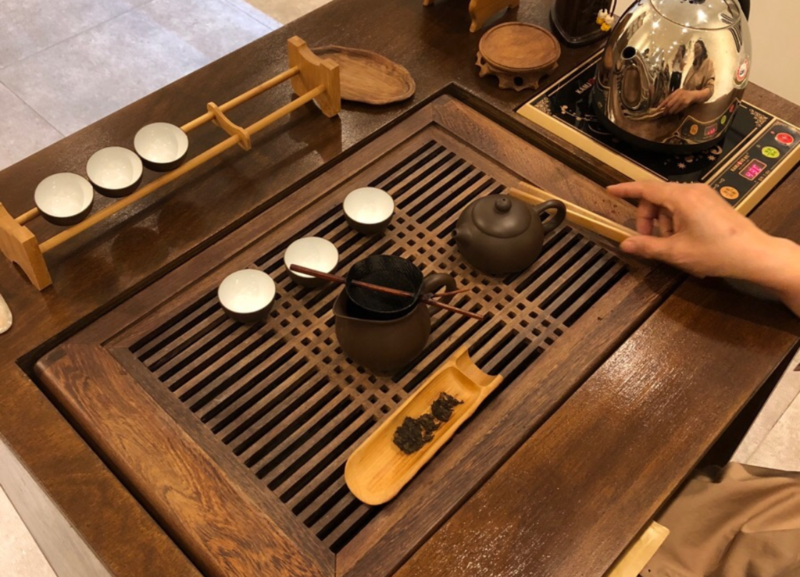 자사호 등 각종 다구가 벽을 가득 채웁니다. 달콤한 디저트와 함께 사장님이 차판 위에서 내려주신 보이차를 마실 수 있습니다.