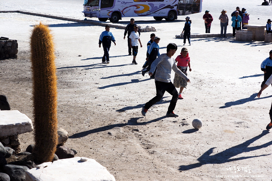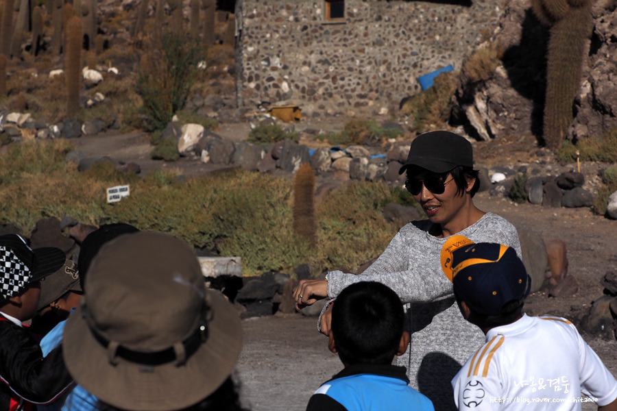 길쭉길쭉한 선인장들이 있는 물고기 섬 앞에서 우린 입장 대신 사막을 바라보는 것을 택했다. 강렬한 햇볕을 피해 정자에 앉아 있는데 '포토시'에서 여행 온 볼리비아 초등학생들이 우리에게 다가와 이것저것 질문을 했다. 무슨 꿍꿍이지? 볼리비아 아이 들치고는 질문이 너무 많은데... 아니나 다를까 얼마 후 검은 속내를 드러냈다.