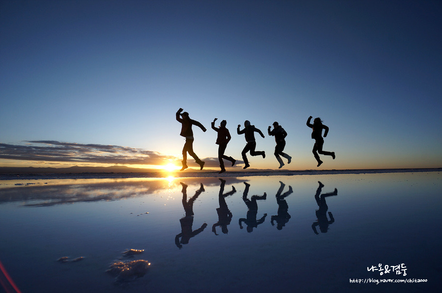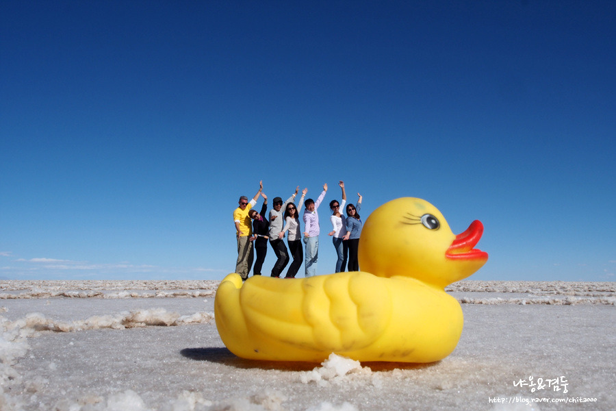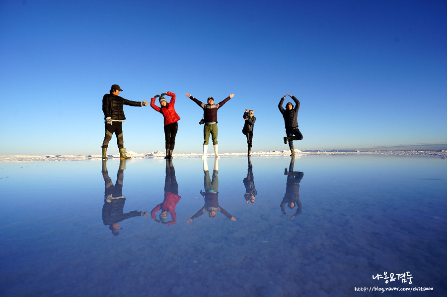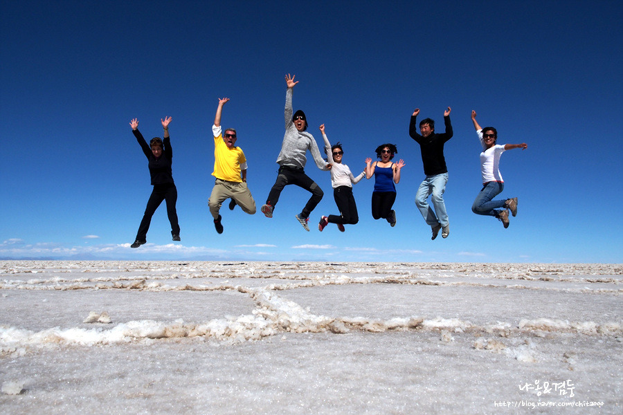 차가 끝없는 사막을 달리 때 내 생각이 기우였음을 깨달았다. 우유니 사막은 물이 없어도 경이로웠다. 사막 표면은 거북이 등껍질을 닮아있었고 지평선은 끝이 보이지 않았다. 오래전 이곳이 모두 바다였다니! 햇빛에 빛나는 저 하얀 것들이 모두 소금이라니! 어마어마한 스케일과 상상할 수 없는 억겁의 세월 앞에 난 고작 '언빌리버블'만 간신히 내뱉은 하루살이 같은 인간 일 뿐이었다. 창밖으로 휙휙 지나가는 거북이 등껍질을 보며 생각에 빠져있는데 가이드가 자그마한 장난감들을 가지고 내렸다. 오호라! 여기서 그 유명한 윈근감 사진을 찍을 모양이군. 몇 장 찍으면 될 거라고 생각했던 것은 큰 오산이었다. 웨딩촬영까지는 아니었지만 우린 점프하고 또 점프하고 손잡고 춤추고 눕고 만세 하며 사진을 찍고 또 찍었다. 처음엔 뭘 이렇게까지 하나 생각하며 심드렁하게 포즈를 취했는데 찍다 보니 입가에 웃음이 비실비실 새어 나왔고 나중에는 좀 더 좋은 사진을 찍기 위해 최선을 다해 포즈를 취했다