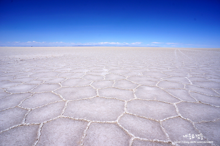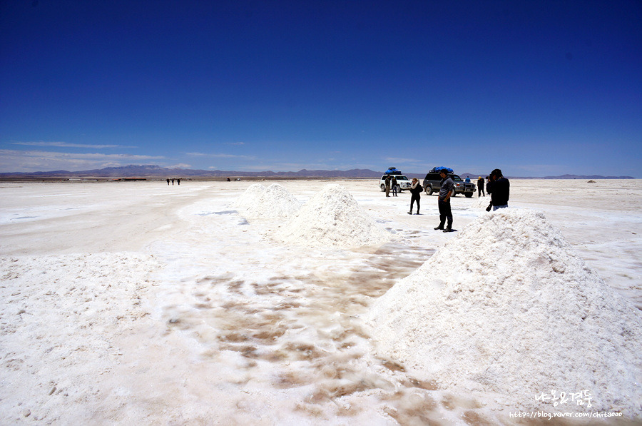 사막에서 사진 찍고 일몰 보고 돌아오는, 일명 '데이투어'를 알아보고 숙소로 돌아오는데 로컬 식당에서 김치볶음밥과 한국 컵라면을 팔고 있었다. 혹시나 하는 마음에 가격을 봤는데 각각 우리나라 돈으로 8000원, 7000원. 볼리비아 물가에 비하면 터무니없이 비싼 가격이지만 수요가 있으니 공급이 있는 거겠지?라고 중얼거리며 발길을 돌렸다. 다음날, 날씨는 우려했던 것과 달리 매우 좋았다. 하늘은 파란 물이 뚝뚝 떨어질 것처럼 새파랬고 공기는 건조기에서 방금 나온 것처럼 가볍고 달달했다. 서둘러 세수를 하고 여행사로 달려가 데이투어를 신청했다. 투어 인원은 총 7명 중에 한국인은 우리뿐. 어떤 모습일까? 과연! 역시! 최고! 를 남발하게 되는 곳일까? 아니면 우기 때 왔어야 했는데... 라며 애써 실망스러운 감정을 감추며 투어를 마치게 될까? 지금은 저 가이드 외에는 아무도 모를 것이다. 뭐, 사막을 제대로 보여주고 밥만 잘 준다면 난, 괜찮다.
