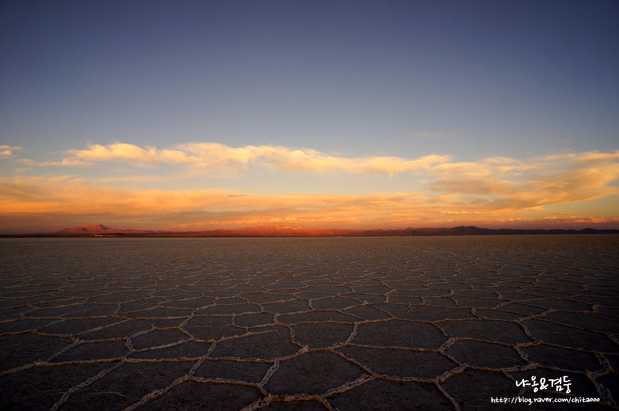 황당해서 두 눈을 껌벅거리며 아이들을 봤는데 그들은 진심이었다. 한라산, 지리산 1900미터. 백두산 2700 미터. 우유니 소금사막 고도는 무려 3700미터. 소금사막에 비하면 다들 난쟁이들이다. 그런데 이 꼬마들은 이곳에서 빠르게 공을 따라가면서 골대를 향해 골을 넣는 축구를 하자고 한다. 그들의 간절한 눈빛을 피할 수 없어 그 어렵게 보이는 '축구'를 했다. 예상대로 몇 분만에 '심장'은 과부하를 일으키며 온몸에 경고를 보냈고 나중에는 심장이 귀에 대고 분 단위로 쌍욕 하는 환청이 들리는 것만 같았다. 아니 이 꼬마들! 심장이 2개, 아니 4개라도 되는 건가? 정말 잘 뛰네. 아! 맞다. 포토시에 왔다고 했었지. 그 도시의 고도는 4000미터였고. 축구가 끝날 때쯤 물고기 섬에 들어갔던 사람들이 차로 돌아왔다. 아이들과 작별을 하고 일몰을 보러 떠났다. 끝없이 펼쳐진 사막 표면이 서서히 붉게 물들어갔다. 그리고 하늘 위에 유유히 떠 있는 구름도, 아무 말 없이 일몰을 바라보고 있는 내 마음도 서서히 붉게 물들어갔다. 자연 앞에 한 없이 겸손해지는 하루다.