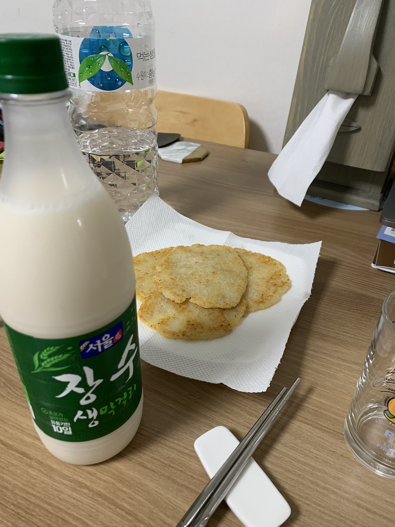 편의점에서 산 막걸리, 방금 부쳐 고소한 냄새가 올라오는 감자전.